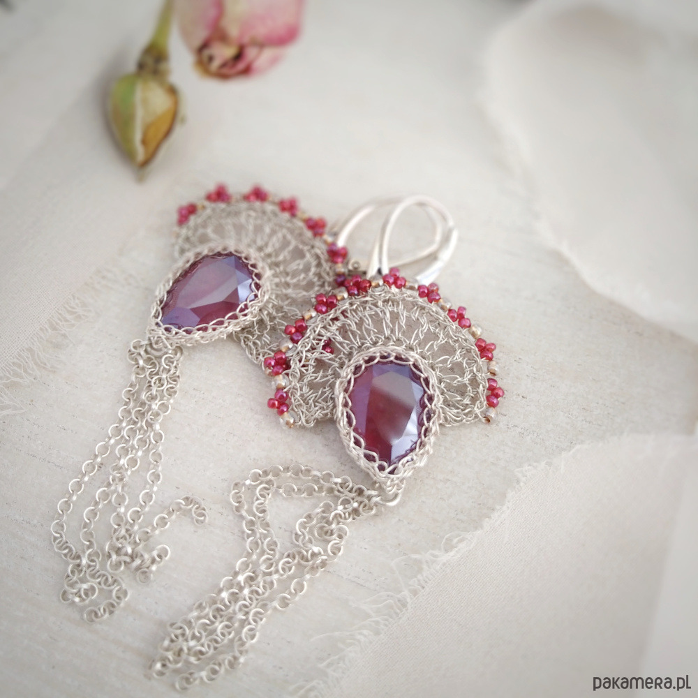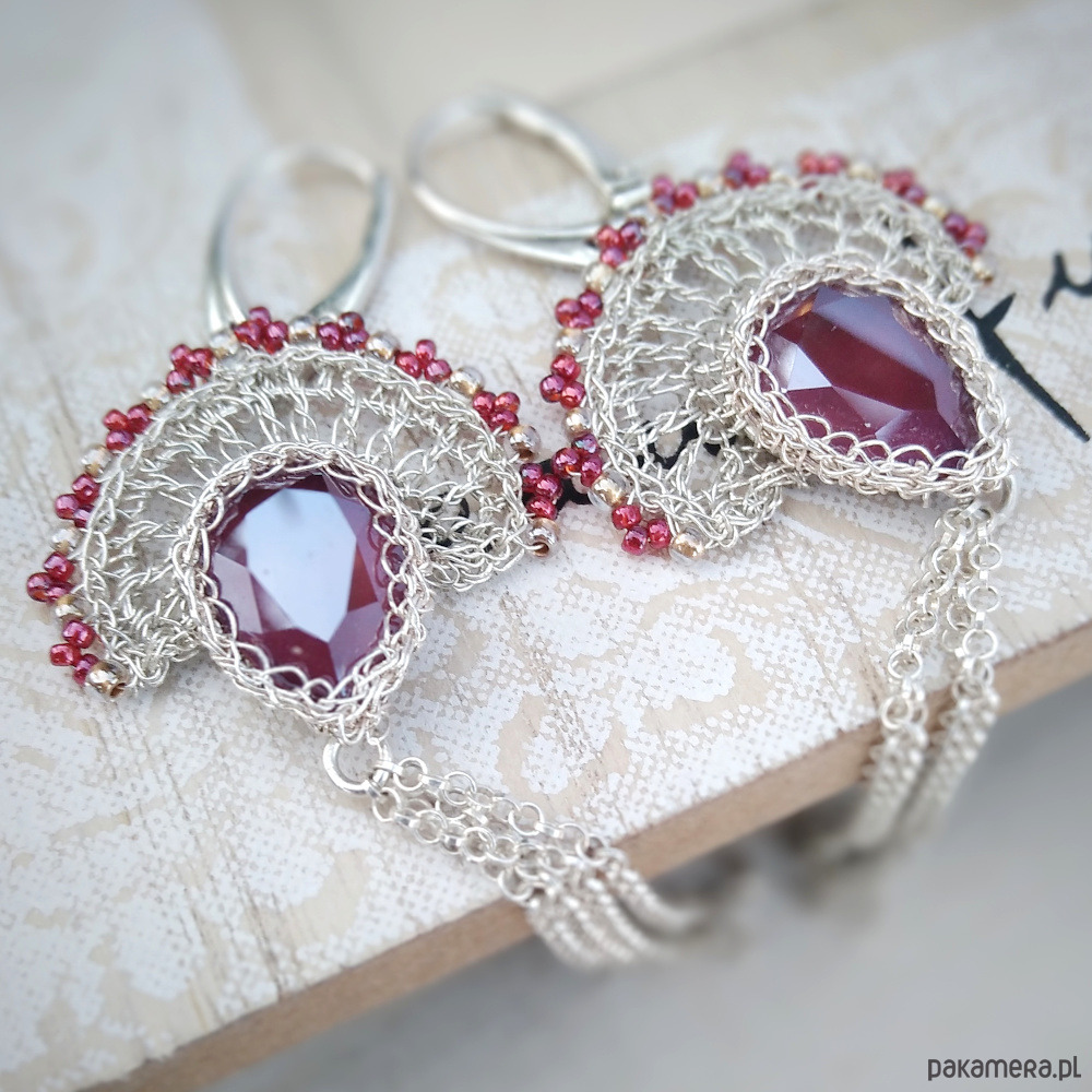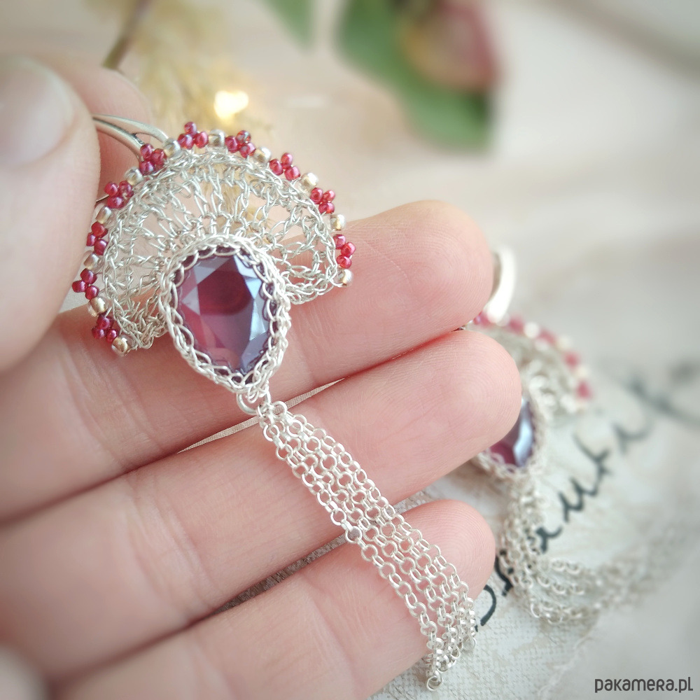 Niezwykle kolczyki ślubne z kryształem w kolorze ciemnej, głębokiej czerwieni powstały ze srebra pr930 i 999. Te wyjątkowe koronkowe kolczyki wpiszą się idealnie w stylizację ślubną w klimacie boho. Ich całkowita długość to 8,7 cm łącznie z biglem angielskim.