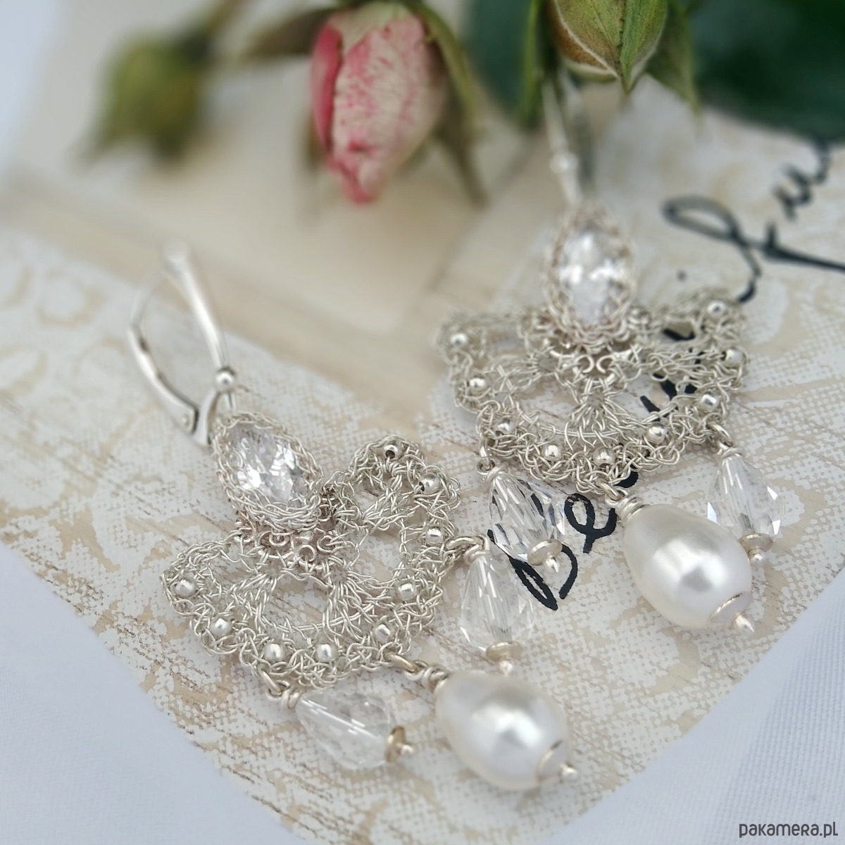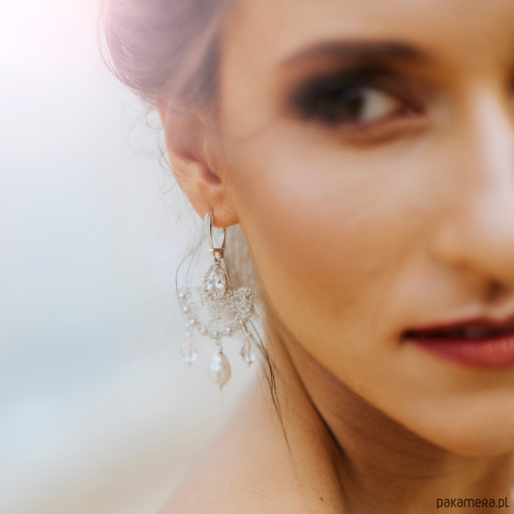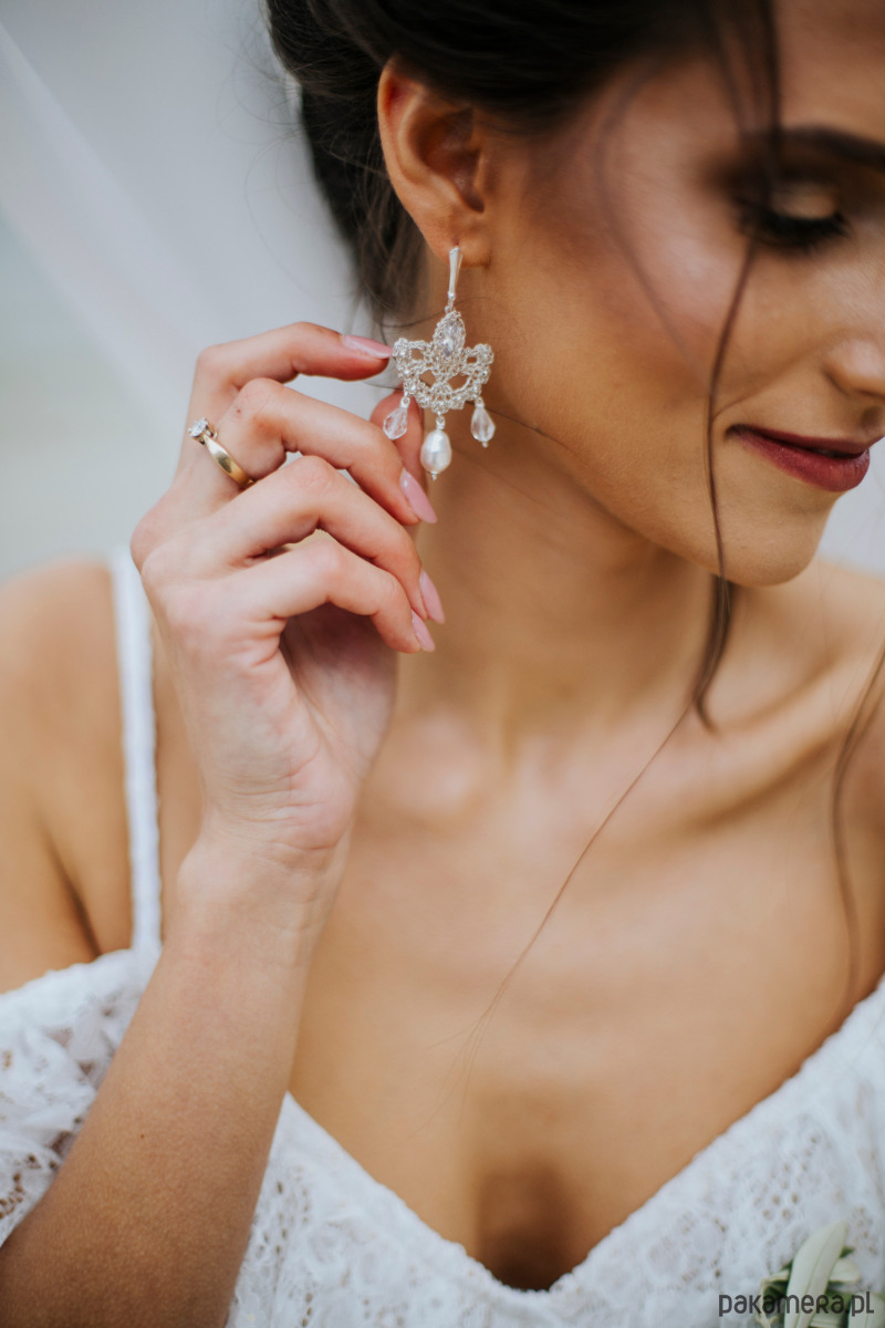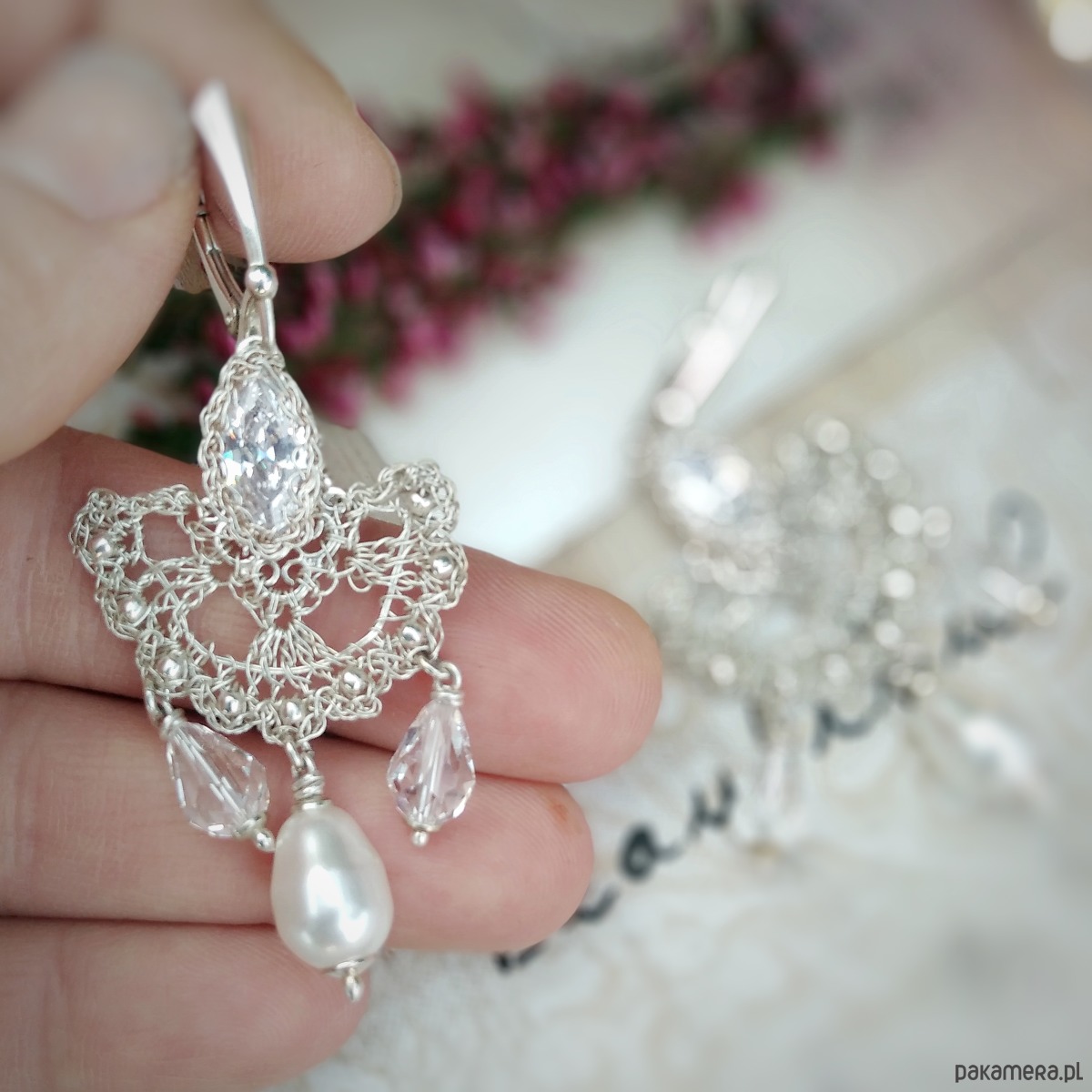 Efektowne i oryginalne kolczyki ślubne Dellussivo to kompozycja srebra pr. 930 i 999, migoczących cyrkonii oraz kryształów i pereł Swarovskiego. Te niezwykłe koronkowe kolczyki wpiszą się w stylizację boho. Kolczyki mierzą 6cm (całkowita długość).