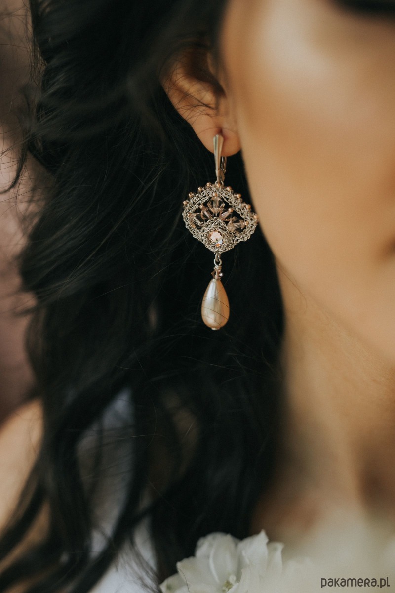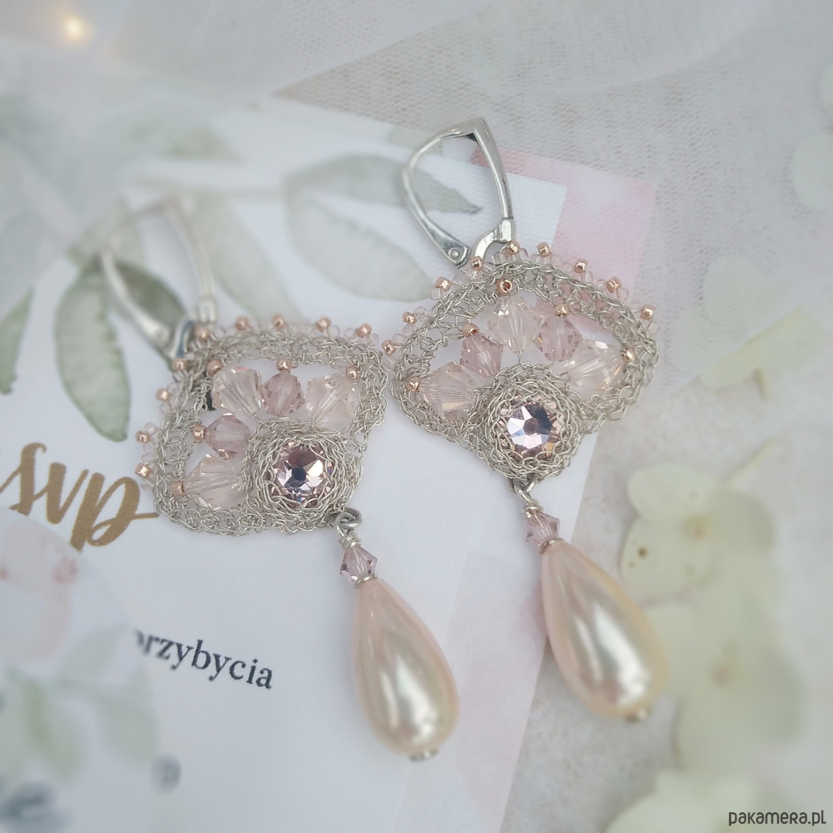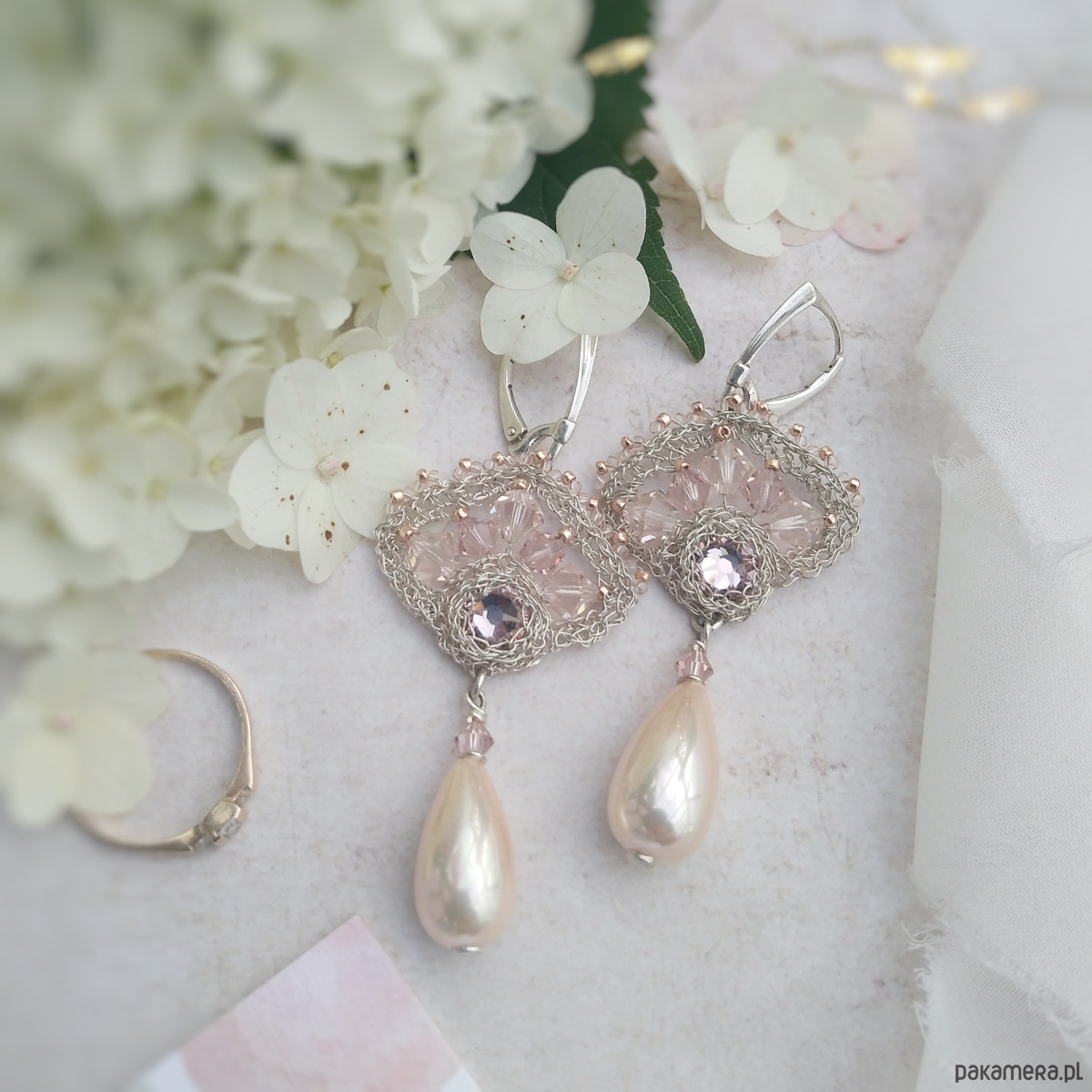 Klasyczne acz z nutą nowoczesności kolczyki ślubne Galia utkane ze srebra. Rozświetlone odrobiną blasku dzięki kryształom w kolorze delikatnego różu. Klasyczną elegancję podkreśla dodatek smukłej perły.