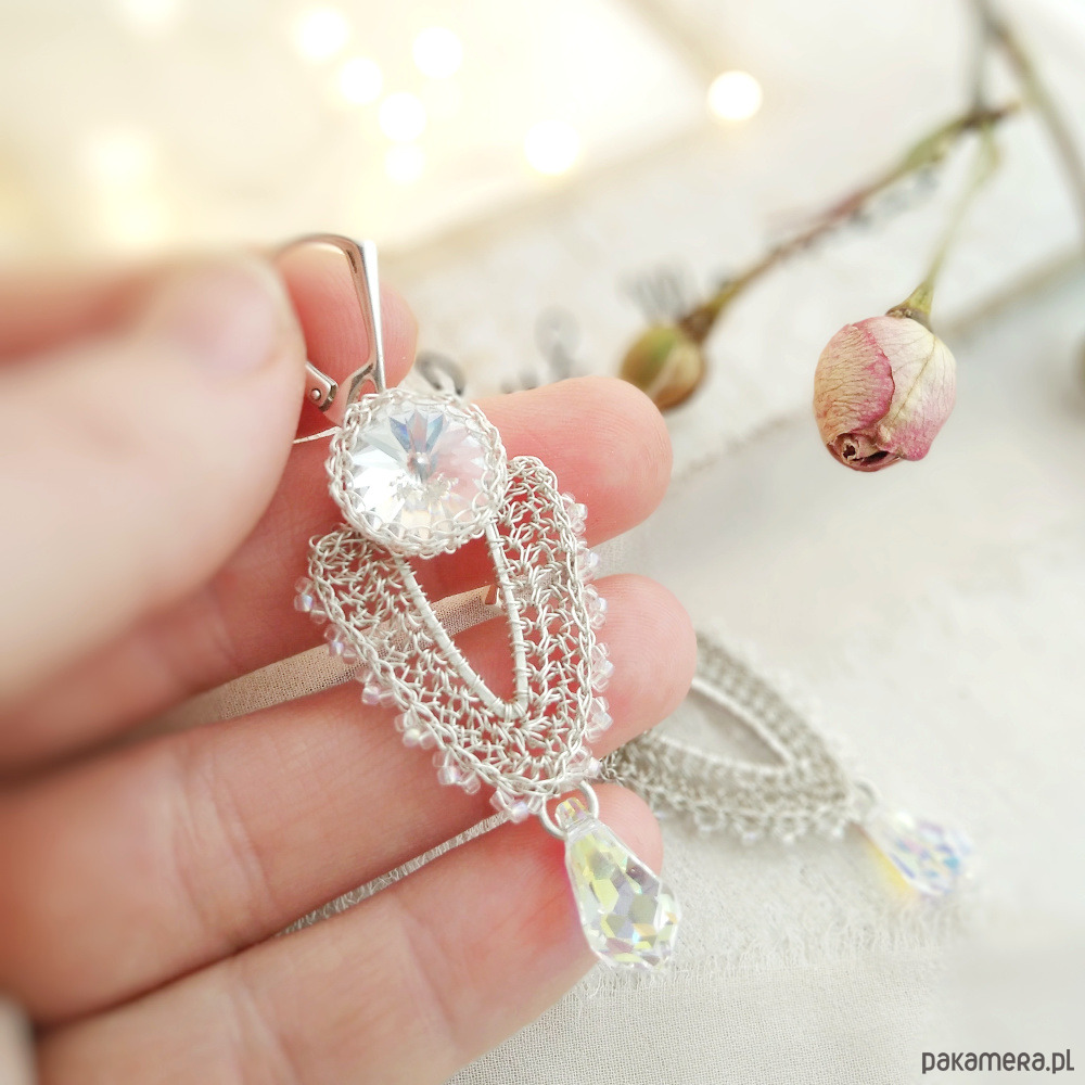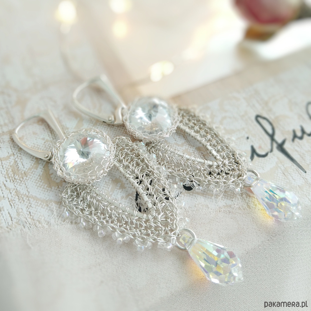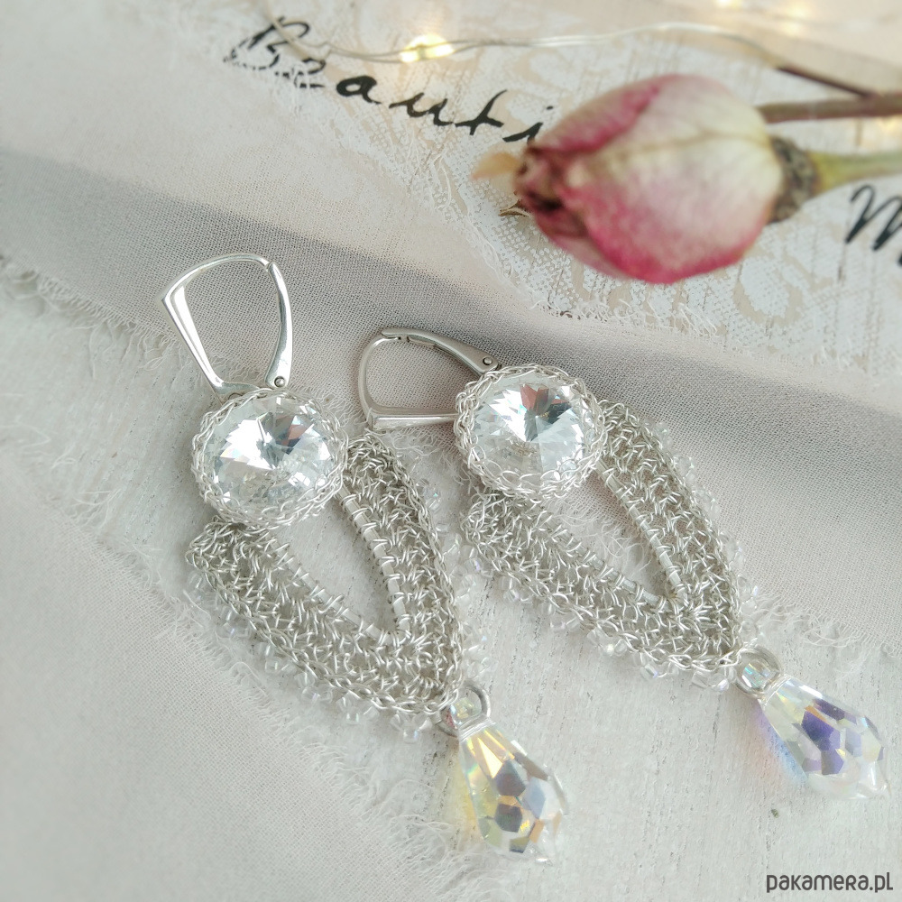Vestario to smukłe kolczyki na ślub wpisujące się w styl glamour. Powstały całkowicie ze srebra oraz olśniewających blaskiem kryształów Swarovski. Kolczyki ślubne Vestrio podkreślą unikatowość stylizacji ślubnej a także przyciągną niejedno spojrzenie wzbudzając zachwyt. Kolczyki te mierzą 6cm łącznie z wygodnym zapięciem z zapadką (bigiel angielski).