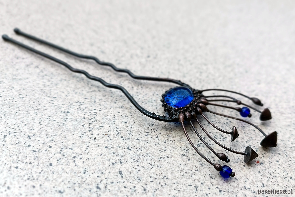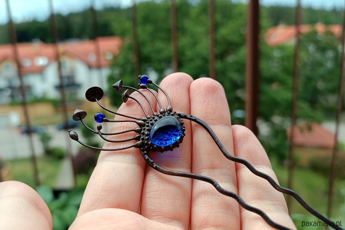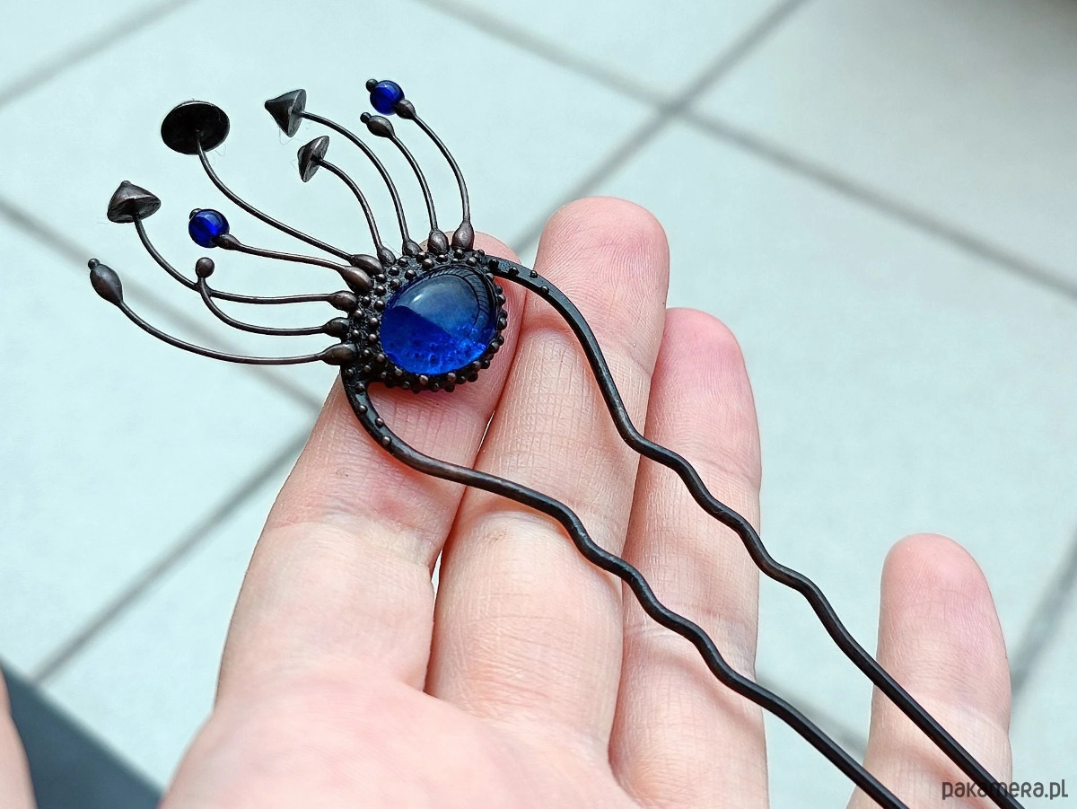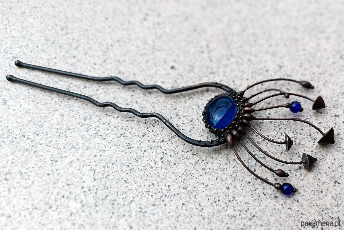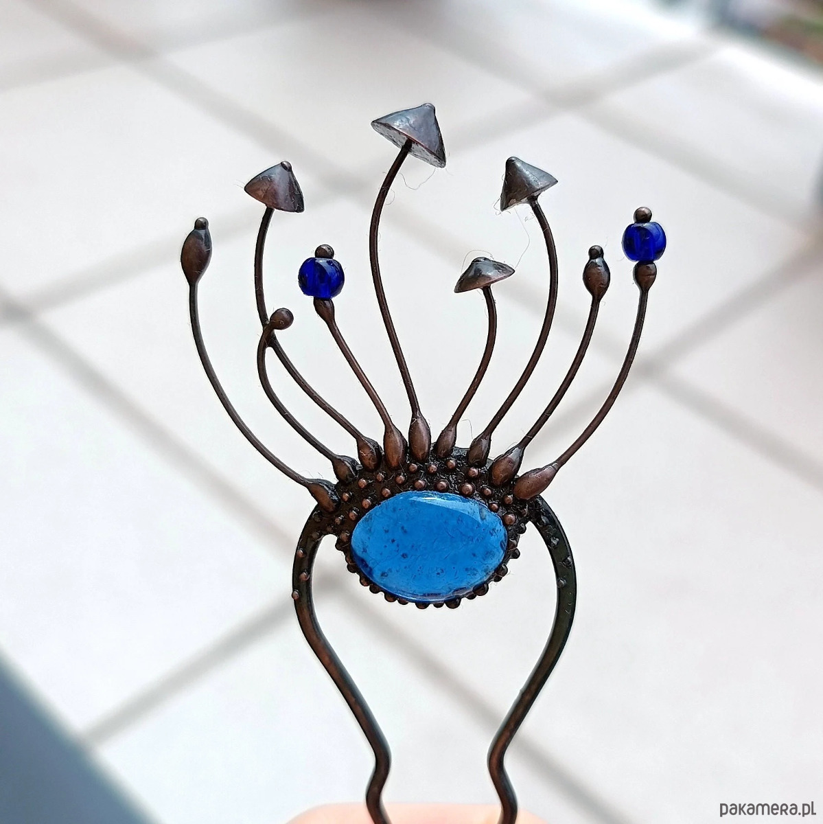 Biżuteria w stylu witchy vibes z magicznym grzybem, ręcznie wykonana spinka do włosów z miedzi, cyny, stali i niebieskiego szkła. Wszystkie elementy są wykonane ręcznie, co zapewnia indywidualność każdego produktu wytworzonego w warsztacie Yadovito. Stop cyny i miedzi jest polerowany roztworem wykończeniowym, aby nadać biżuterii szlachetny wygląd, a jednocześnie zapobiec utlenianiu się metalu. Każda biżuteria wygląda indywidualnie, ponieważ czapeczki magicznych grzybów są wykonywane ręcznie, a nie odlewane lub tłoczone.Kolor czarny/niebieski. Rozmiar około 14/4,5 cm.