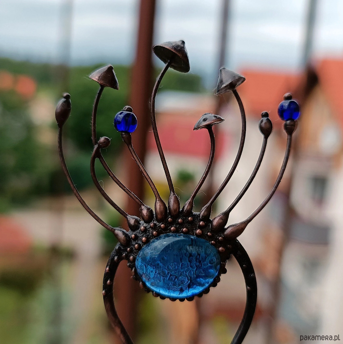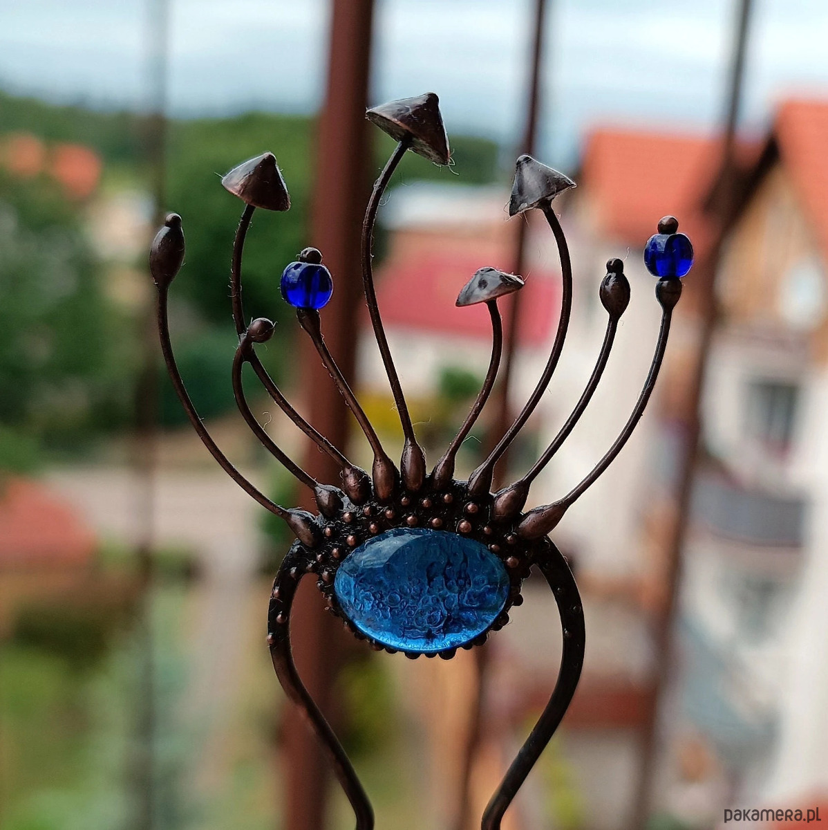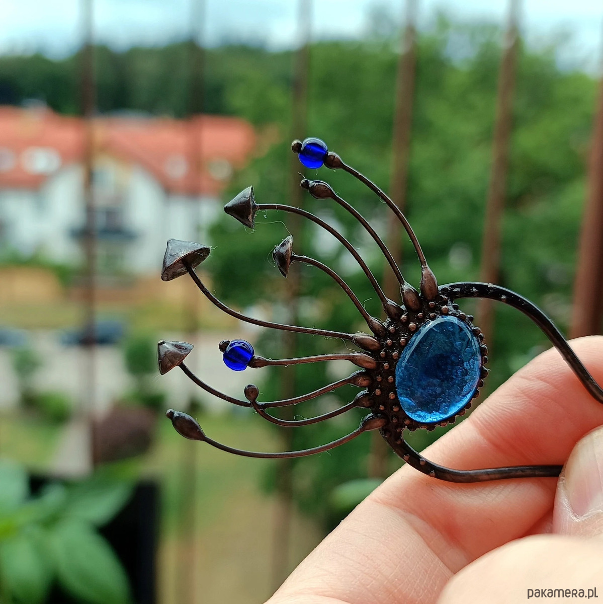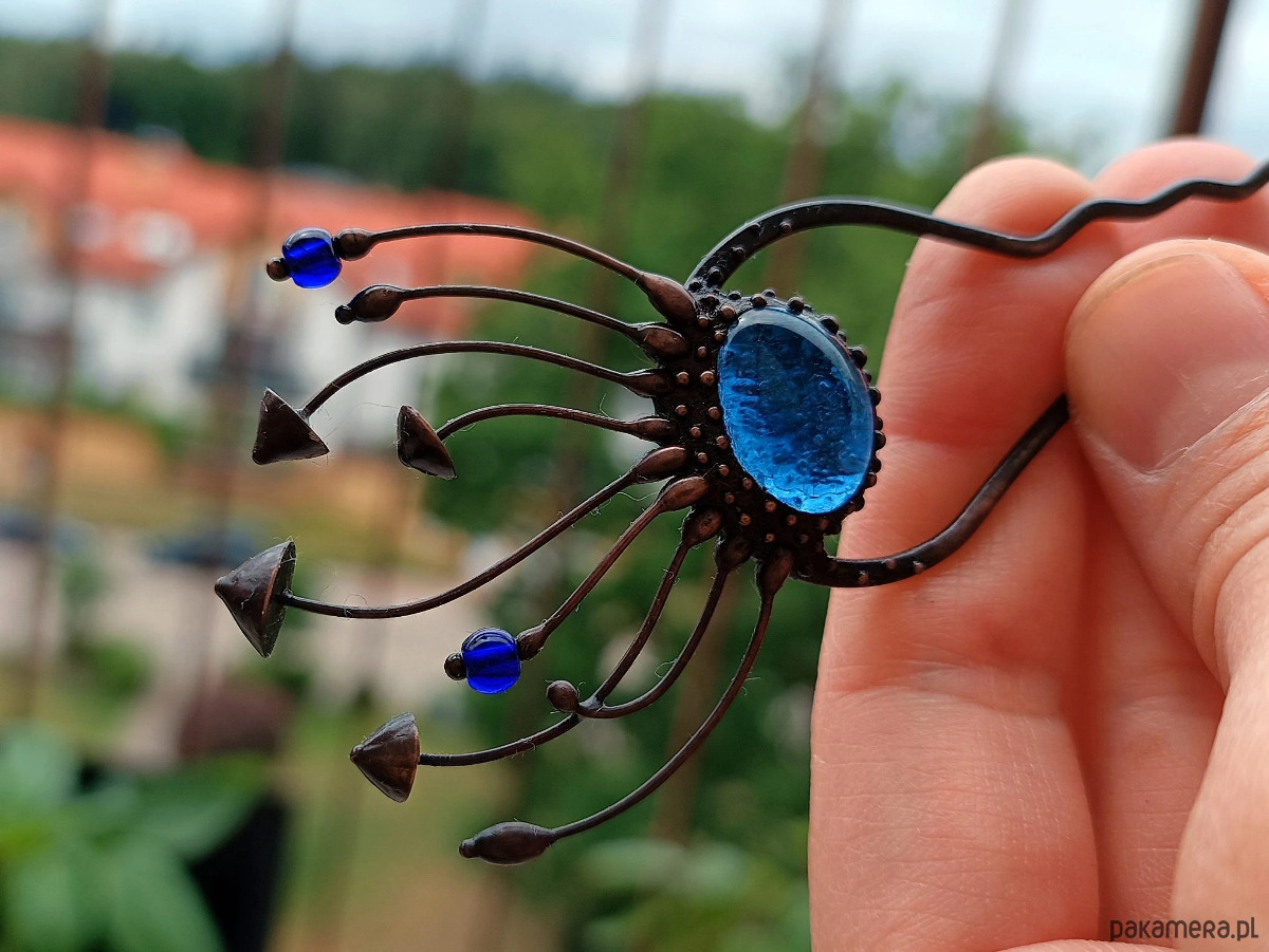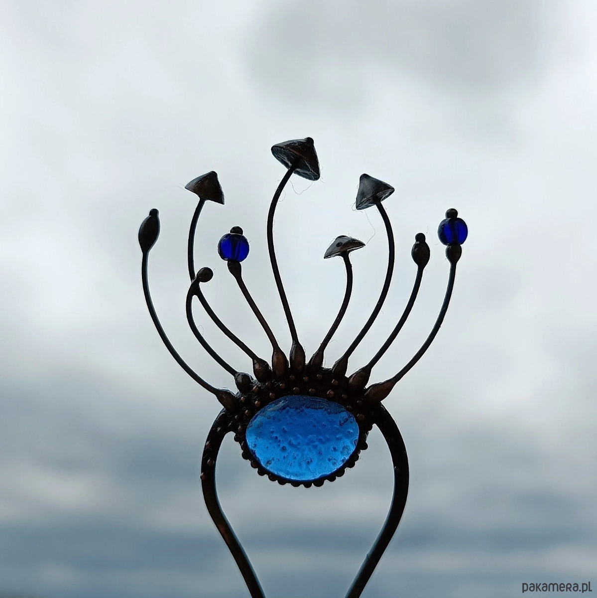 Biżuteria w stylu witchy vibes z magicznym grzybem, ręcznie wykonana spinka do włosów z miedzi, cyny, stali i niebieskiego szkła. Wszystkie elementy są wykonane ręcznie, co zapewnia indywidualność każdego produktu wytworzonego w warsztacie Yadovito. Stop cyny i miedzi jest polerowany roztworem wykończeniowym, aby nadać biżuterii szlachetny wygląd, a jednocześnie zapobiec utlenianiu się metalu. Każda biżuteria wygląda indywidualnie, ponieważ czapeczki magicznych grzybów są wykonywane ręcznie, a nie odlewane lub tłoczone.Kolor czarny/niebieski. Rozmiar około 14/4,5 cm.