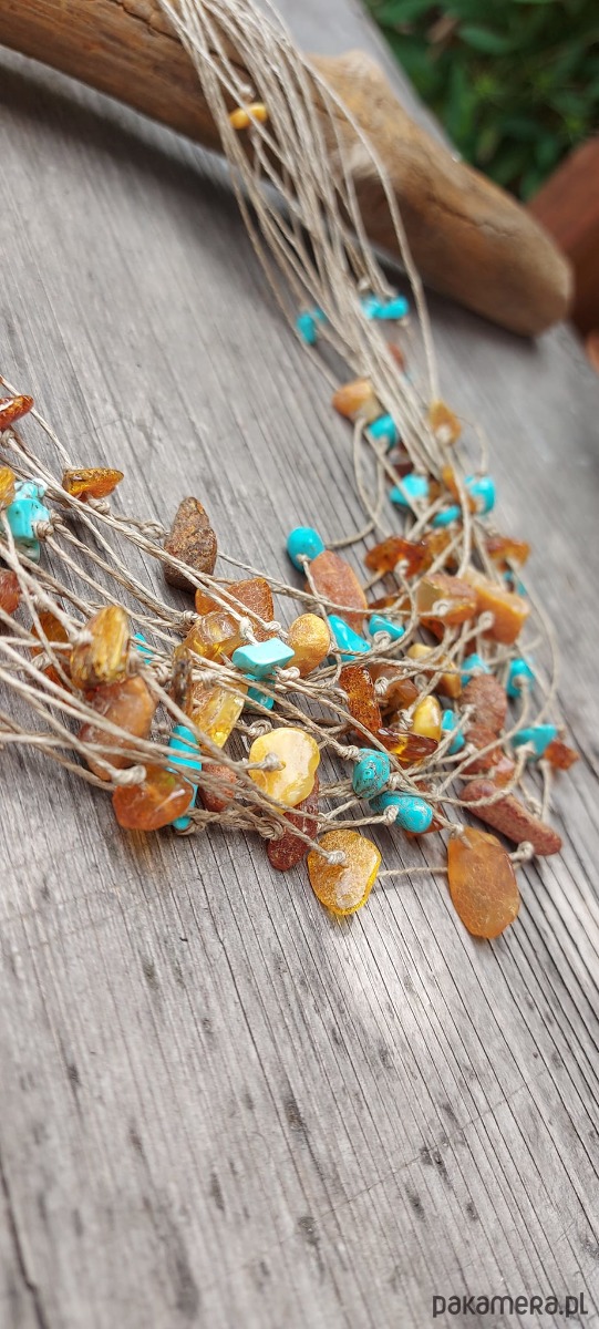 Ten piękny naszyjnik jest kombinacją nici lnianej bursztynu i turkusu