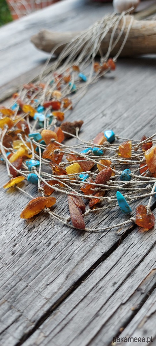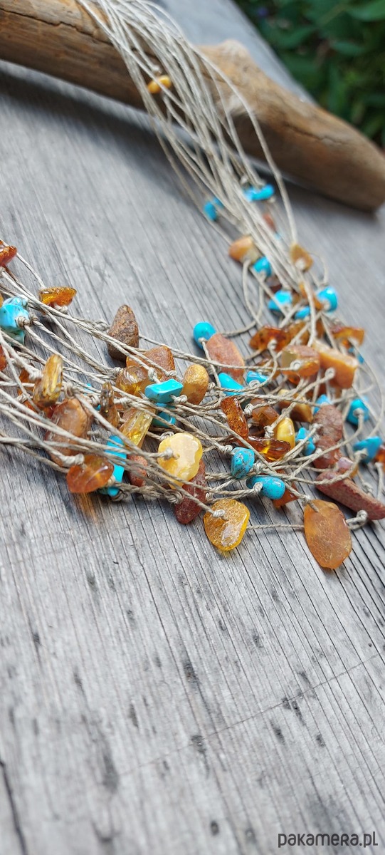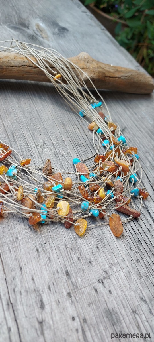 Ten piękny naszyjnik jest kombinacją nici lnianej bursztynu i turkusu