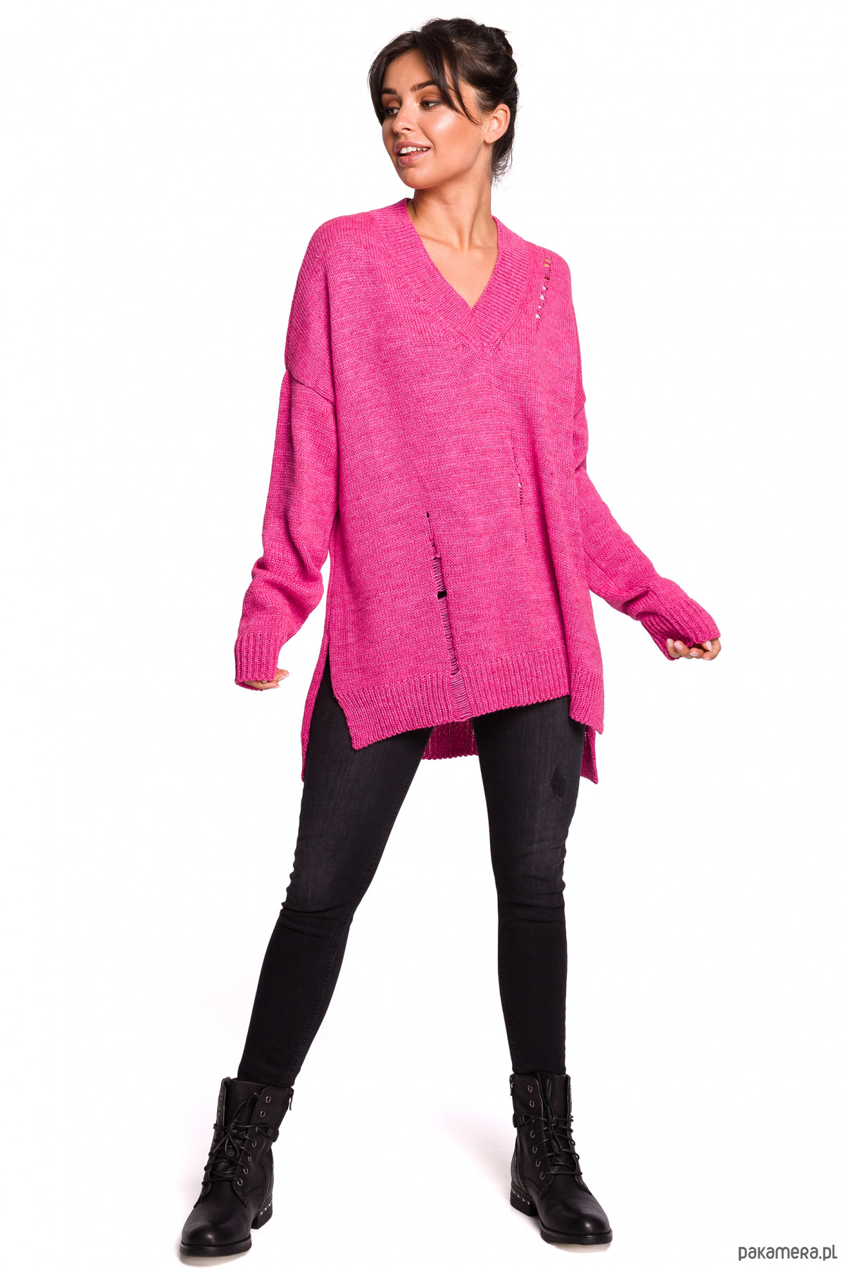 Prosty, oversizowy fason z dekoltem w kształcie litery V wykończonym prążkowanym ściągaczem; ten sweter z modnym akcentem - dziurami i oczkami dającymi efekt postarzenia -będzie hitem.