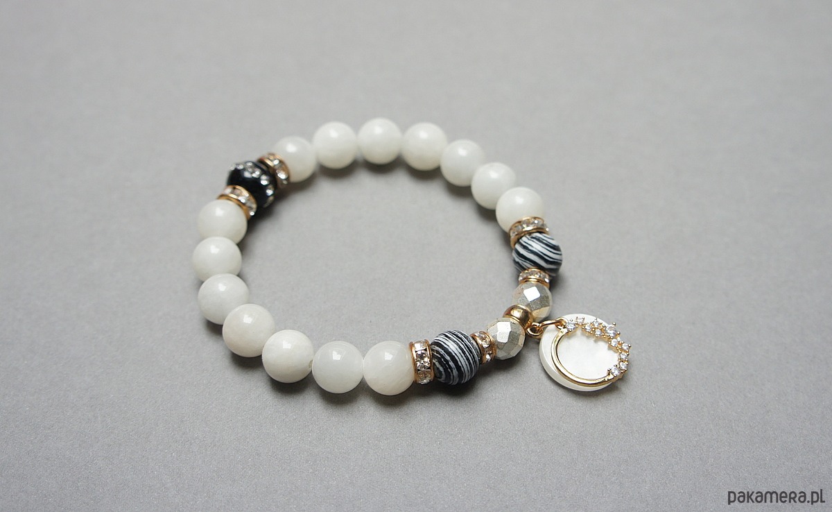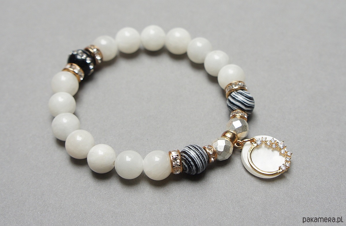 Bransoletka wykonana z naturalnych kamieni - jadeit [10mm], onyks wysadzany cyrkoniami [10mm], turkus rekonstruowany [10mm], hematyt fasetowany, platerowany [8mm], zawieszki wysadzanej cyrkoniami, zawieszki z żywicy oraz elementów metalowych w kolorze złota. Bransoletka na gumce silikonowej. Pasuje na nadgarstek 16-17cm. Biżuteria ozdobnie zapakowana.