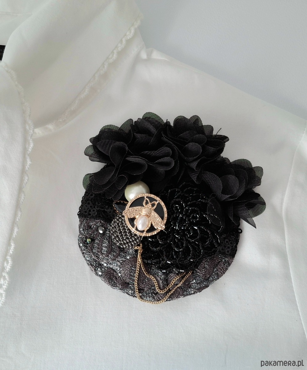 broszka wykonana w technice kolażu w pojedynczym egzemplarzu z myślą o osobach, które szukają urozmaicenia przy codziennych stylizacjach. Jest w niej zawarte wiele struktur i odcieni.Głęboka czerń i złoto dodają szyku kreacji będąc jednocześnie bardzo uniwersalnym dodatkiem który można wykorzystać do wielu stylizacji.