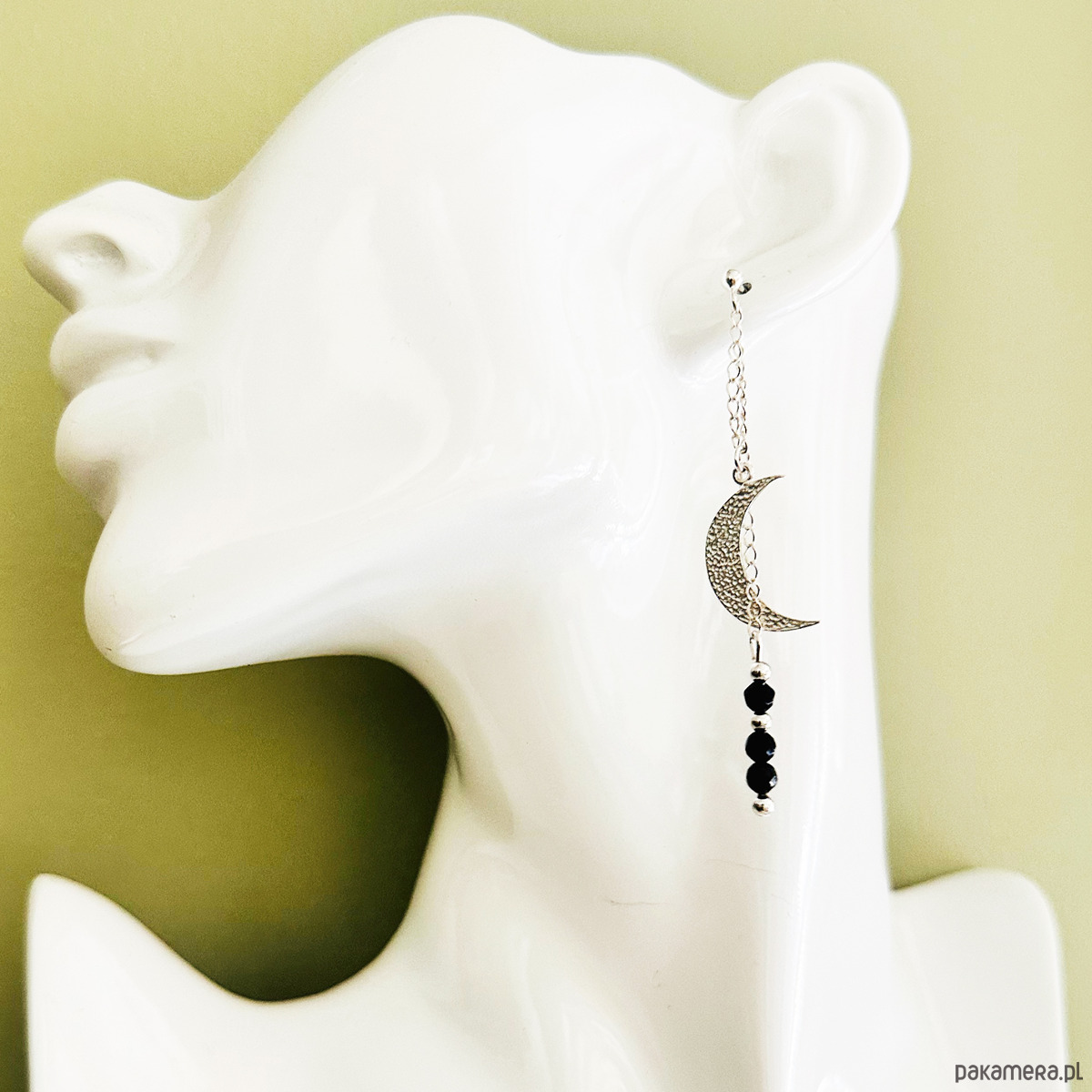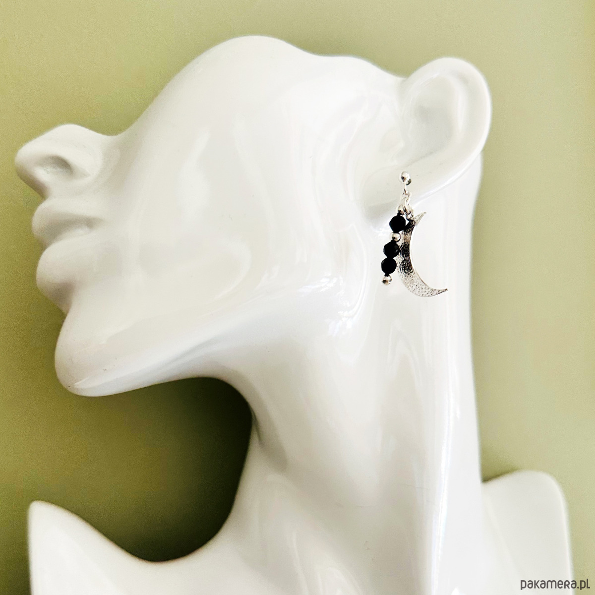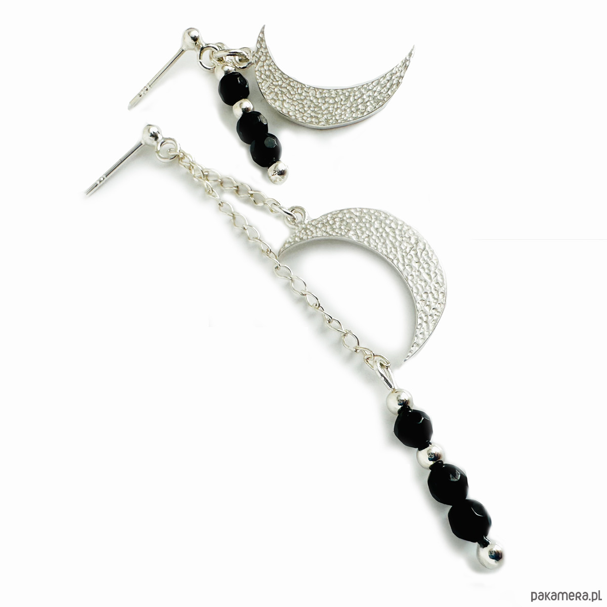 Efektowne kolczyki z dużą, młotkowaną zawieszką w kształcie księżyca i czarnym onyksem.