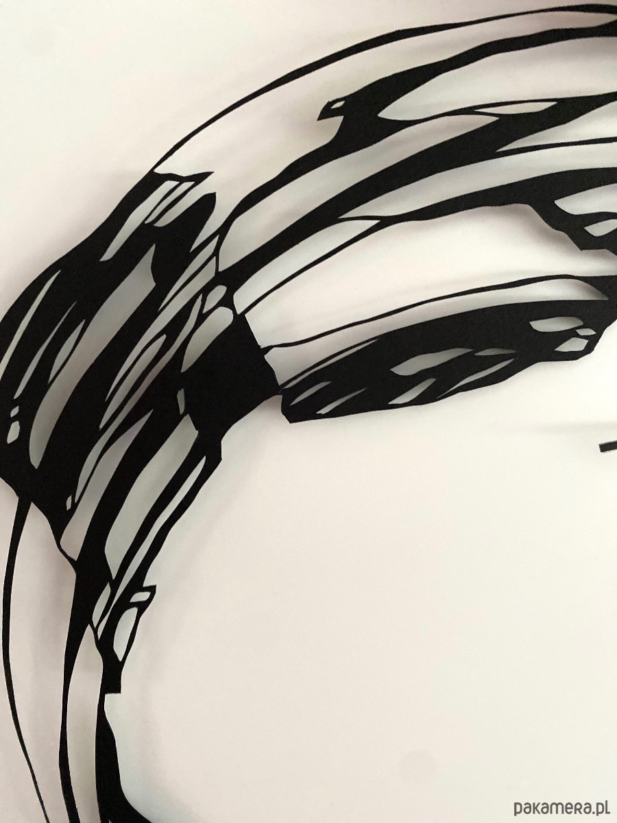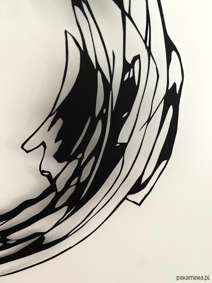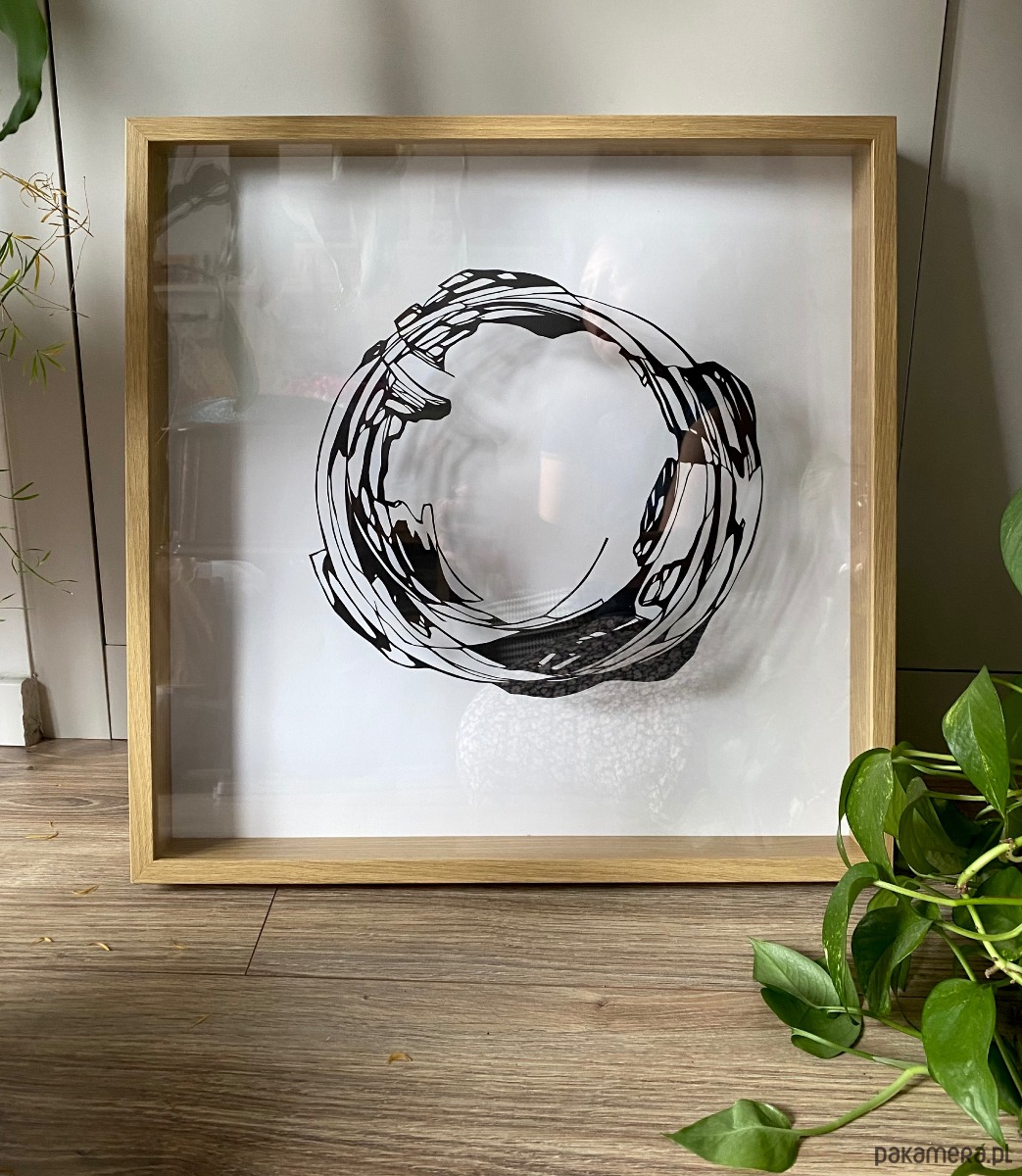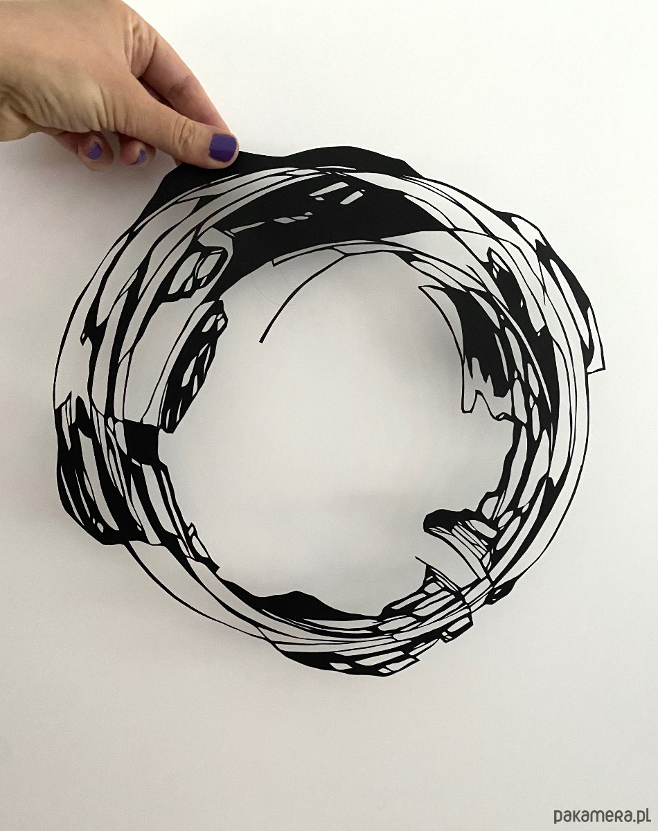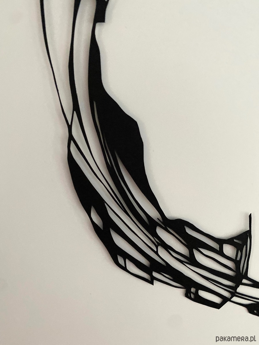 To unikatowe ręcznie wycinane dzieło czerpie inspirację z Enso — japońskiej sztuki — oraz organicznych kształtów plam czarnego tuszu. Kompozycja przedstawia odważną, nieregularną formę koła, która równoważy płynność i precyzję, przywołując zarówno ruch, jak i spokój.