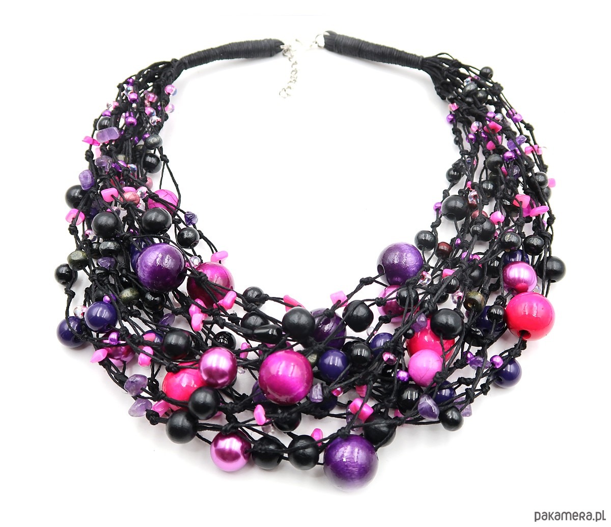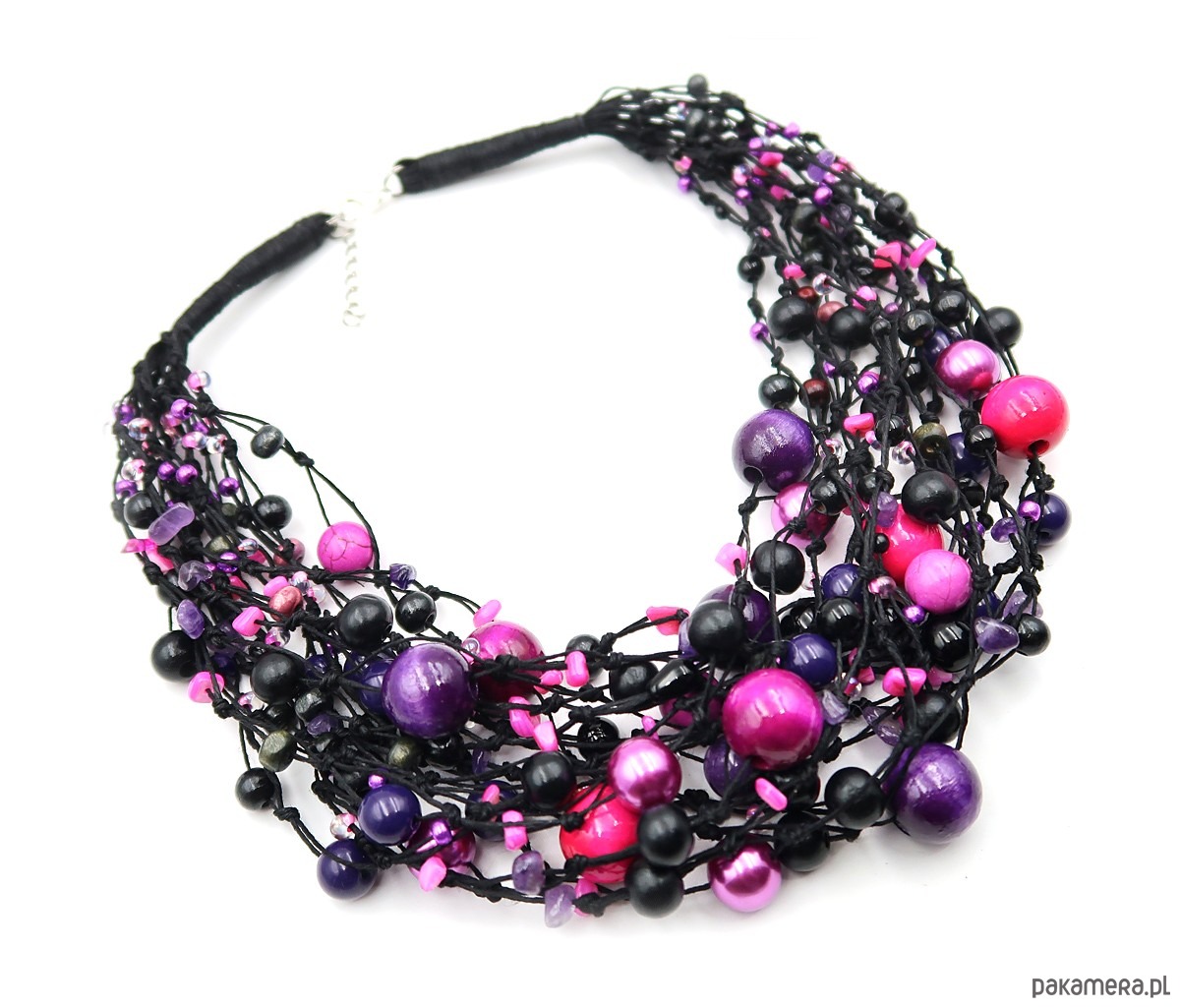 Wieczorowy naszyjnik wykonany ręcznie na czarnej przędzy lnianej, w której splocie układa się harmonijna kompozycja w odcieniach głębokich fioletów, fuksjowego różu i czerni. Całość przyciąga uwagę wyrazistością, a jednocześnie zachowuje elegancki, szlachetny charakter.
