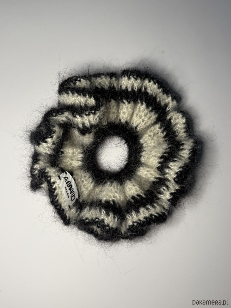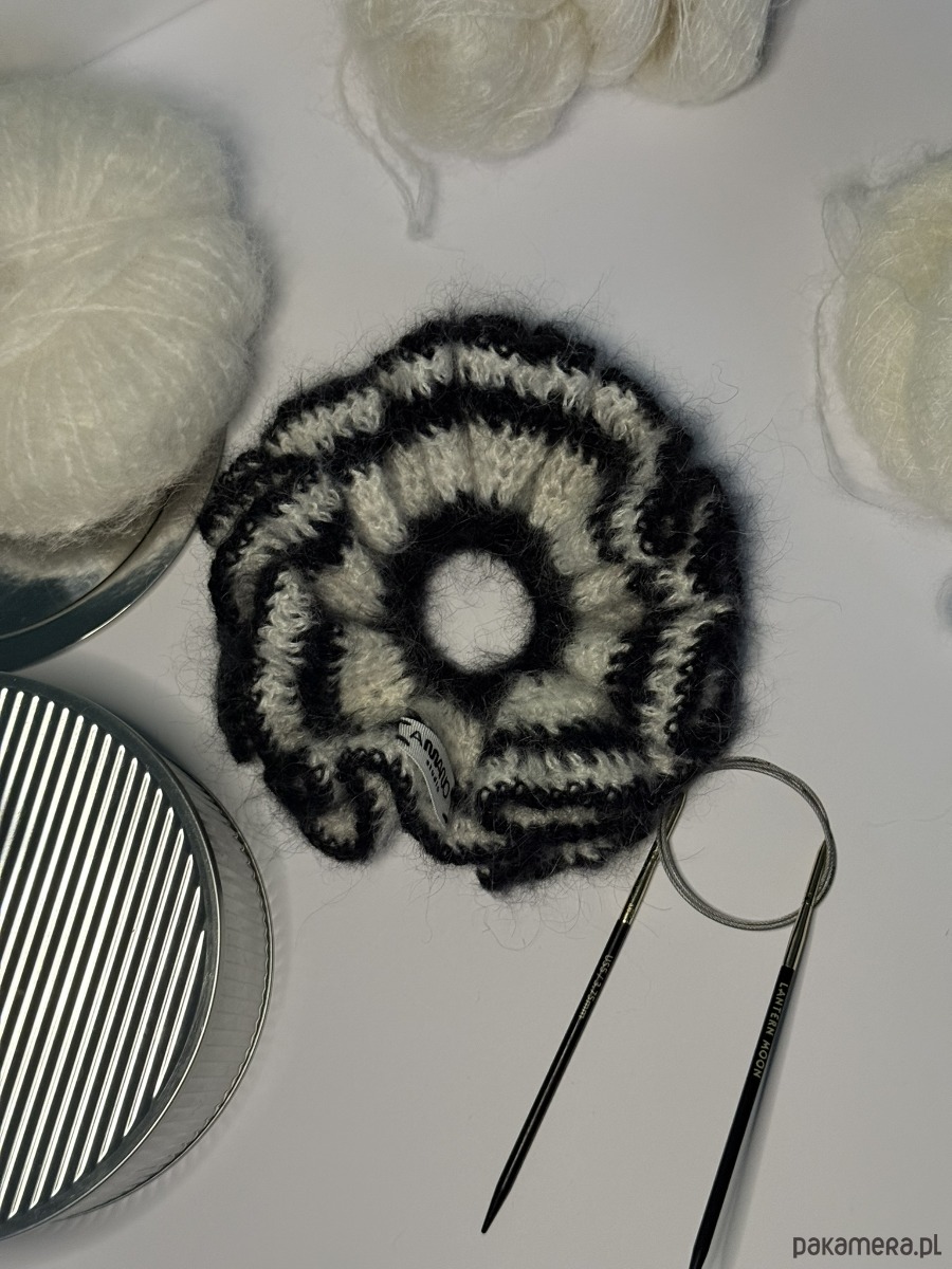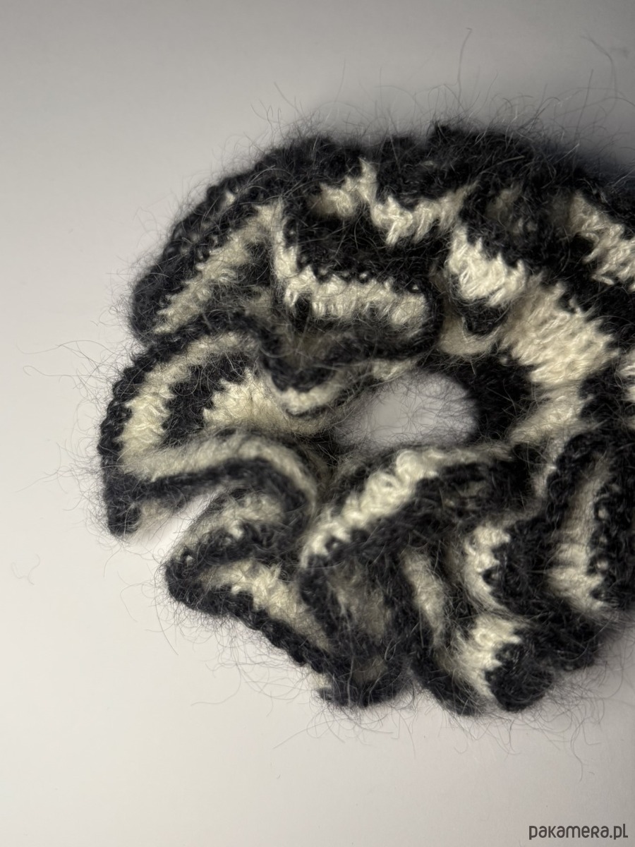 Gumka do włosów wykonana na szydełku z dwóch kolorów włóczki - czarnej i białej. Skład włóczki to 75% moher, 25% jedwab.