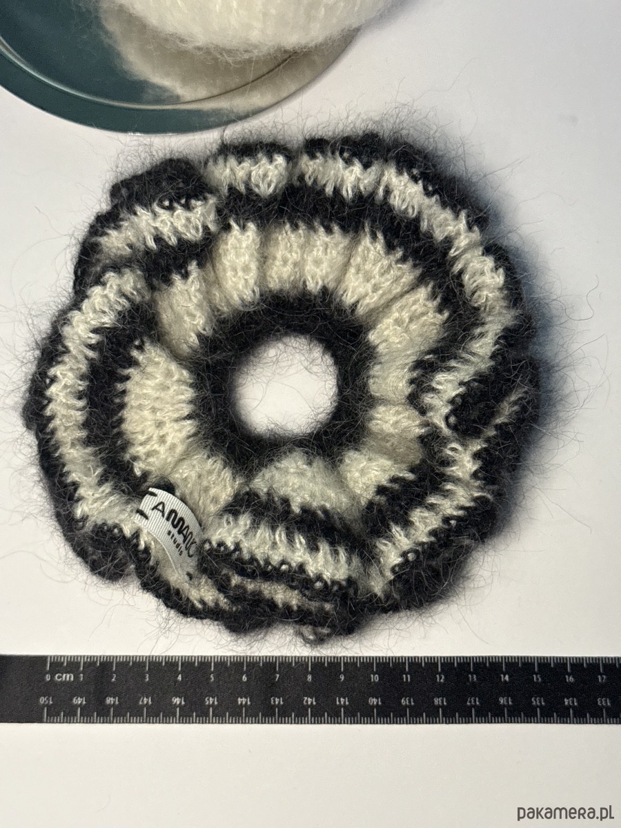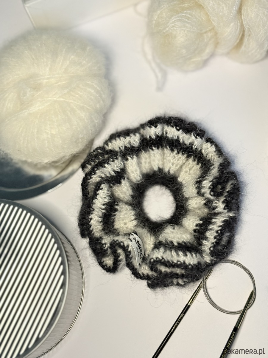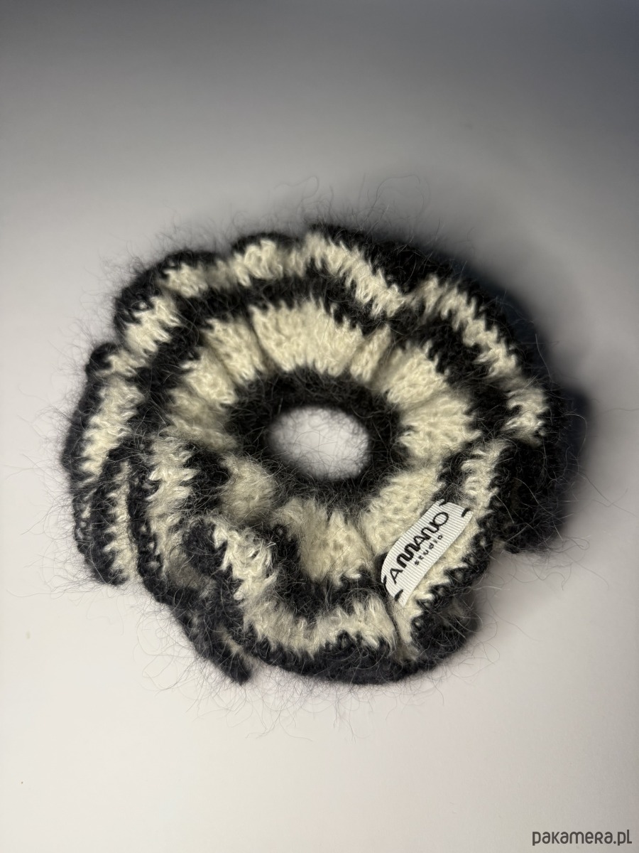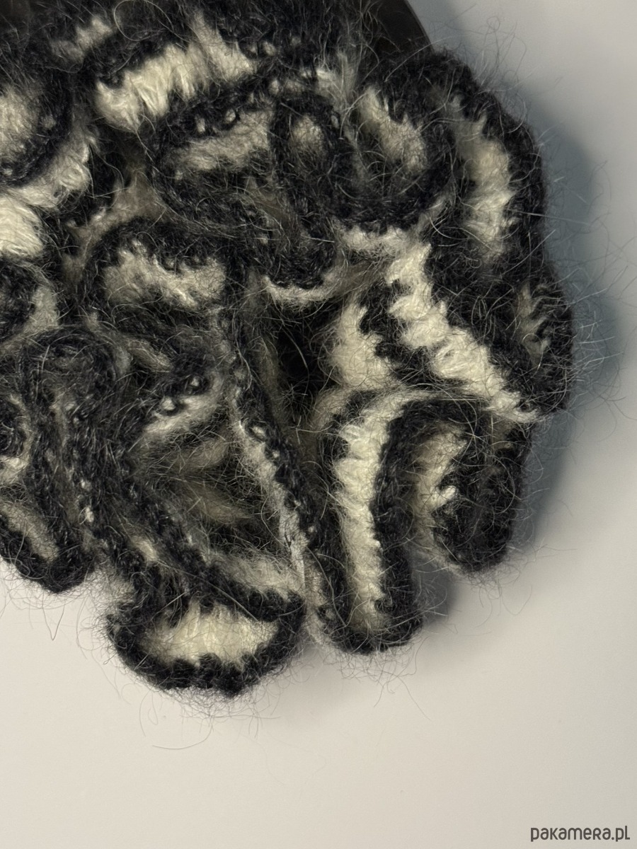 Gumka do włosów wykonana na szydełku z dwóch kolorów włóczki - czarnej i białej. Skład włóczki to 75% moher, 25% jedwab.