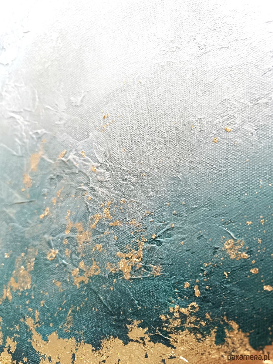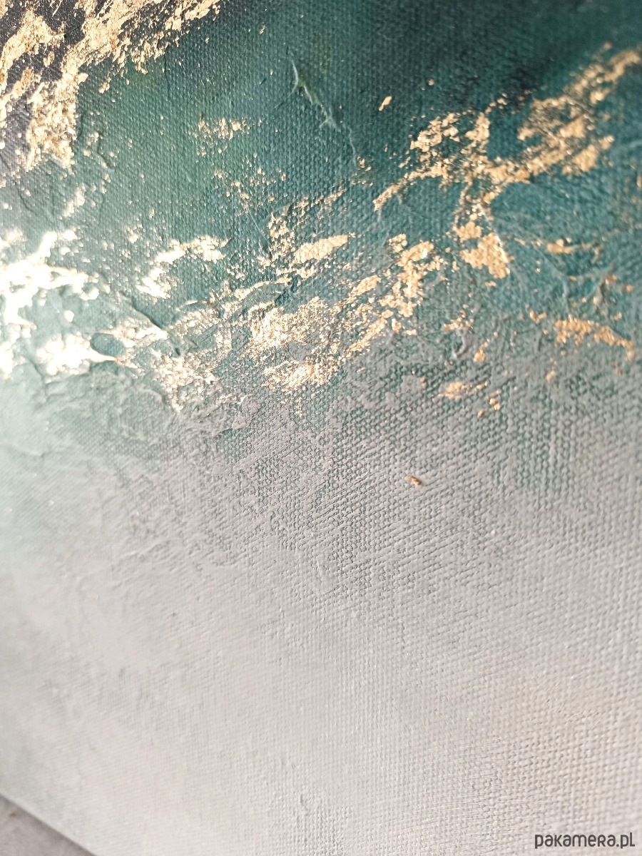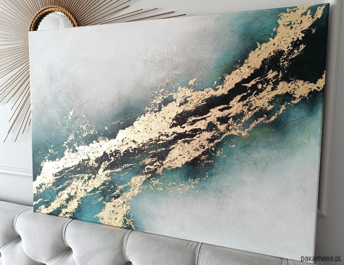 Delikatne przejścia miękkich szarości, turkusów i głębokich tonów łączą się tutaj z eleganckimi złotymi akcentami, które nadają całości blask i szlachetność.