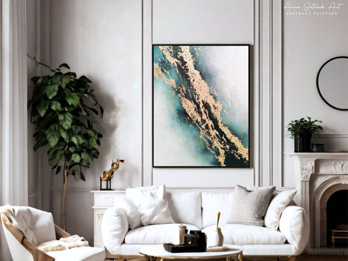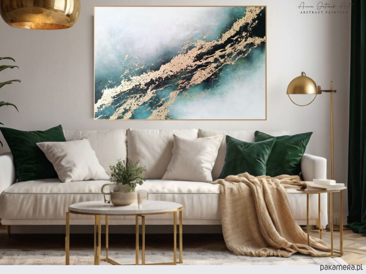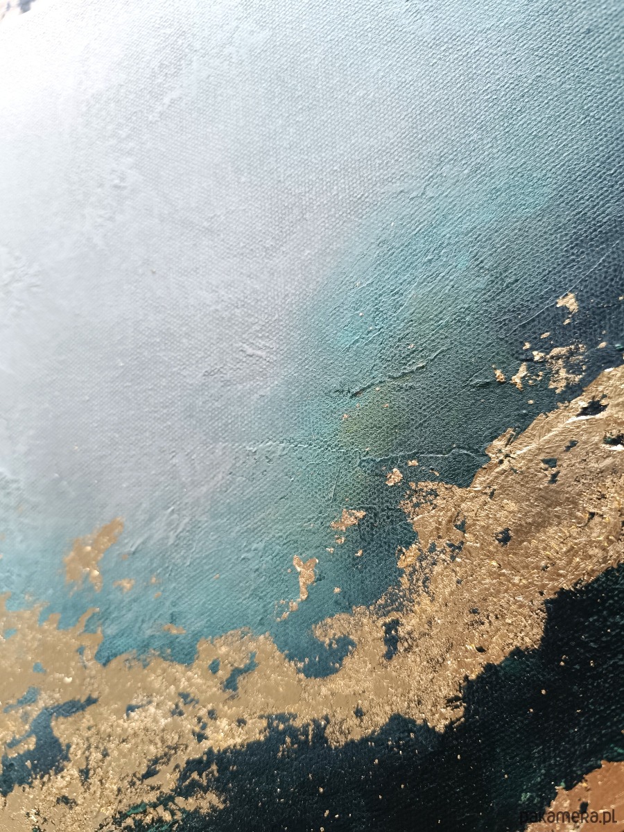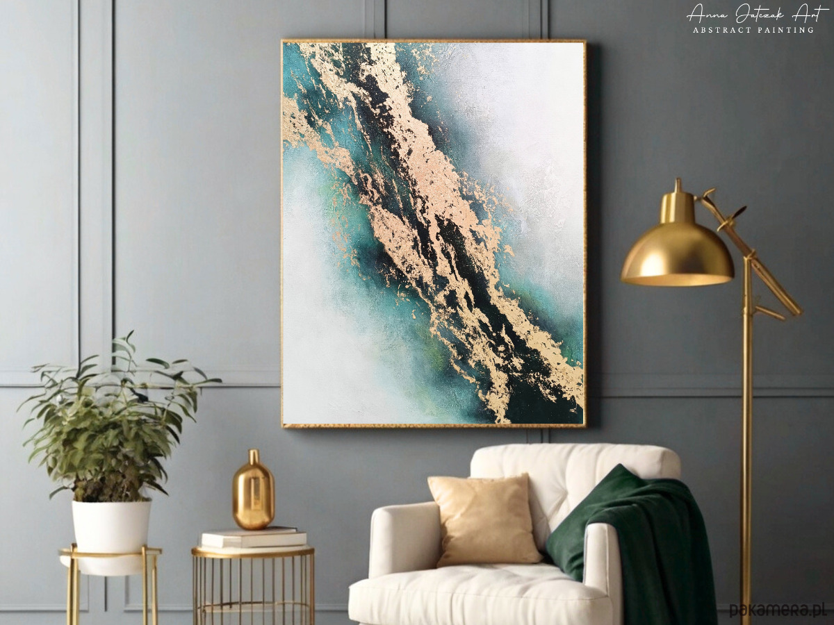 Delikatne przejścia miękkich szarości, turkusów i głębokich tonów łączą się tutaj z eleganckimi złotymi akcentami, które nadają całości blask i szlachetność.