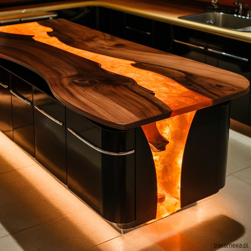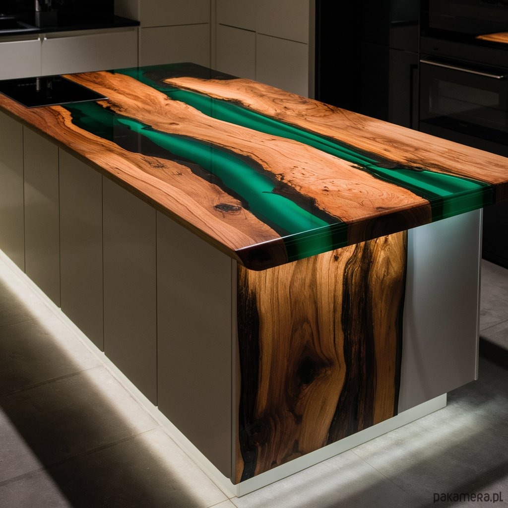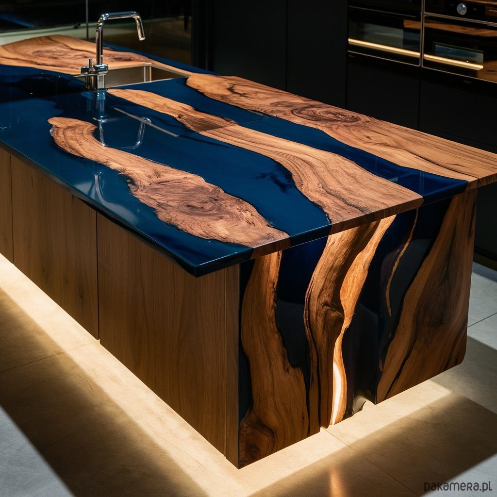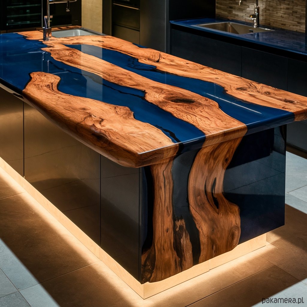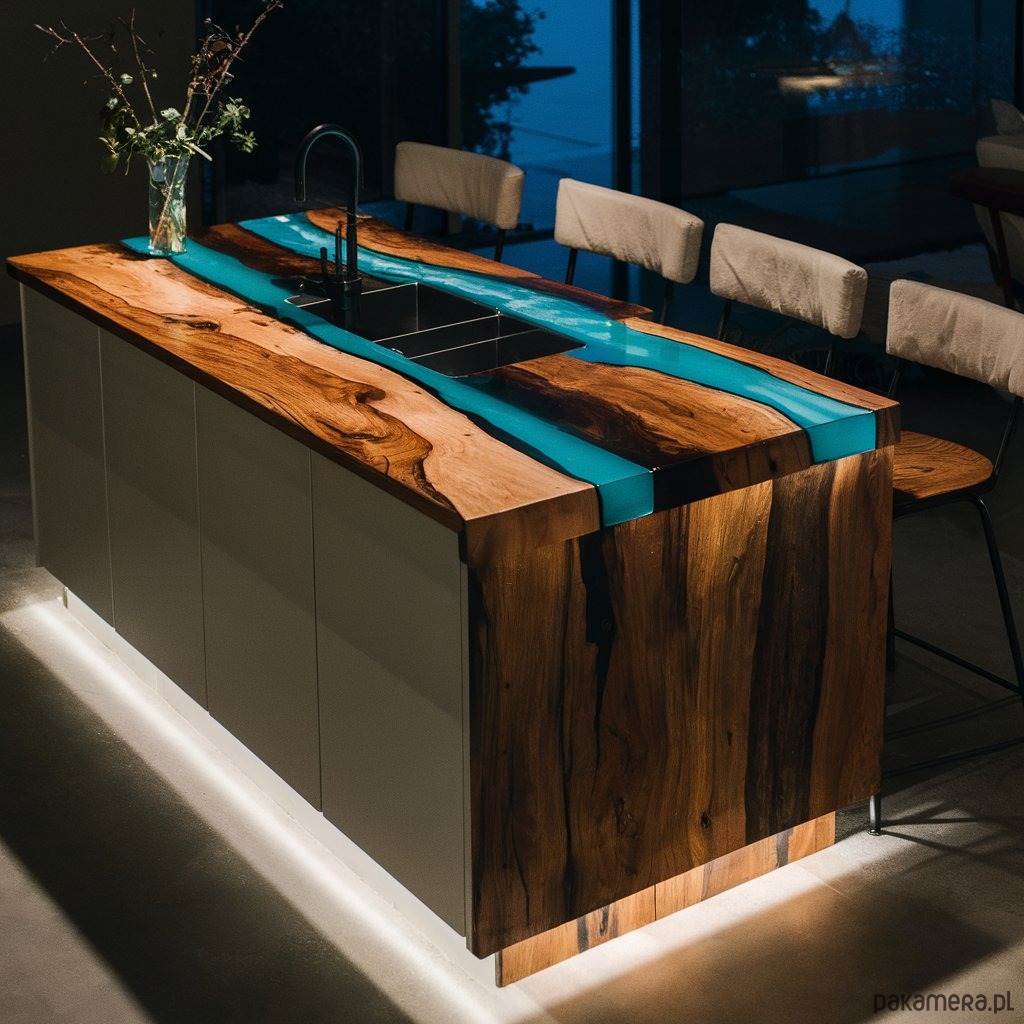 realizujemy pod zamówienie klienta projekty z drewna i żywicy epoksydowej według preferencji jest dostępnych kilkadziesiąt kolorów transparentnych tak jak na zdjęciach czy też nietransparentnych. Najczęściej używane przy blatach kuchennych są żywice transparentne które można podświetlić i dzięki temu dodać wspaniałych efektów wizualnych swym ekskluzywnym meblom