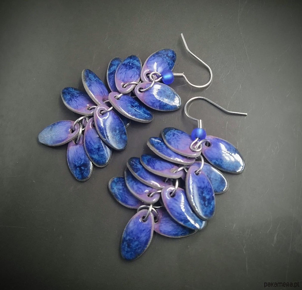 Oryginalne i efektowne wieloelementowe, ceramiczne kolczyki w formie gronek, ręcznie wykonane z delikatnej gliny kamionkowej, jednostronnie szkliwione mieszanką błyszczących błękitnych i fioletowych szkliw z efektem plamek, na biglach ze stali chirurgicznej w kolorze srebra. Długość około 5cm. Polecam