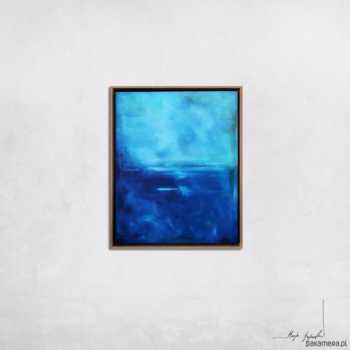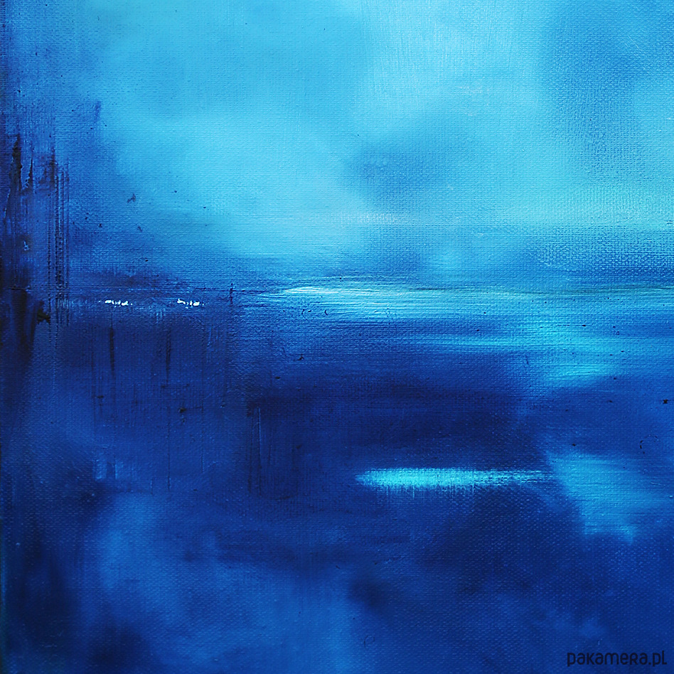 Abstrakcyjny obraz olejny z dominującą paletą barw delikatnego błękitu, turkusu i granatowego. Kolorystyka obrazu rozjaśni i doda świeżości salonowi lub sypialni oraz stworzy centralny punkt na ścianie.