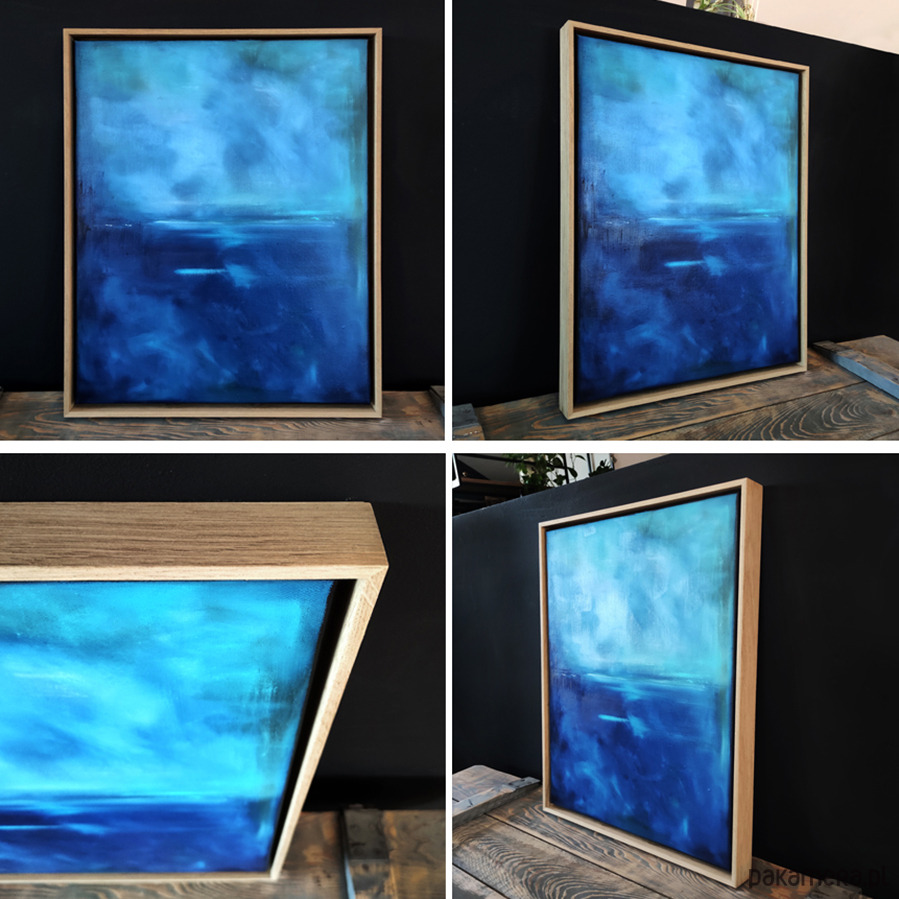 Obraz olejny w formacie 50x40cm (wymiar z ramą 53x43x4cm). Oprawiony w szeroką ramę z naturalnego, dębowego drewna. Typ oprawy - american box.