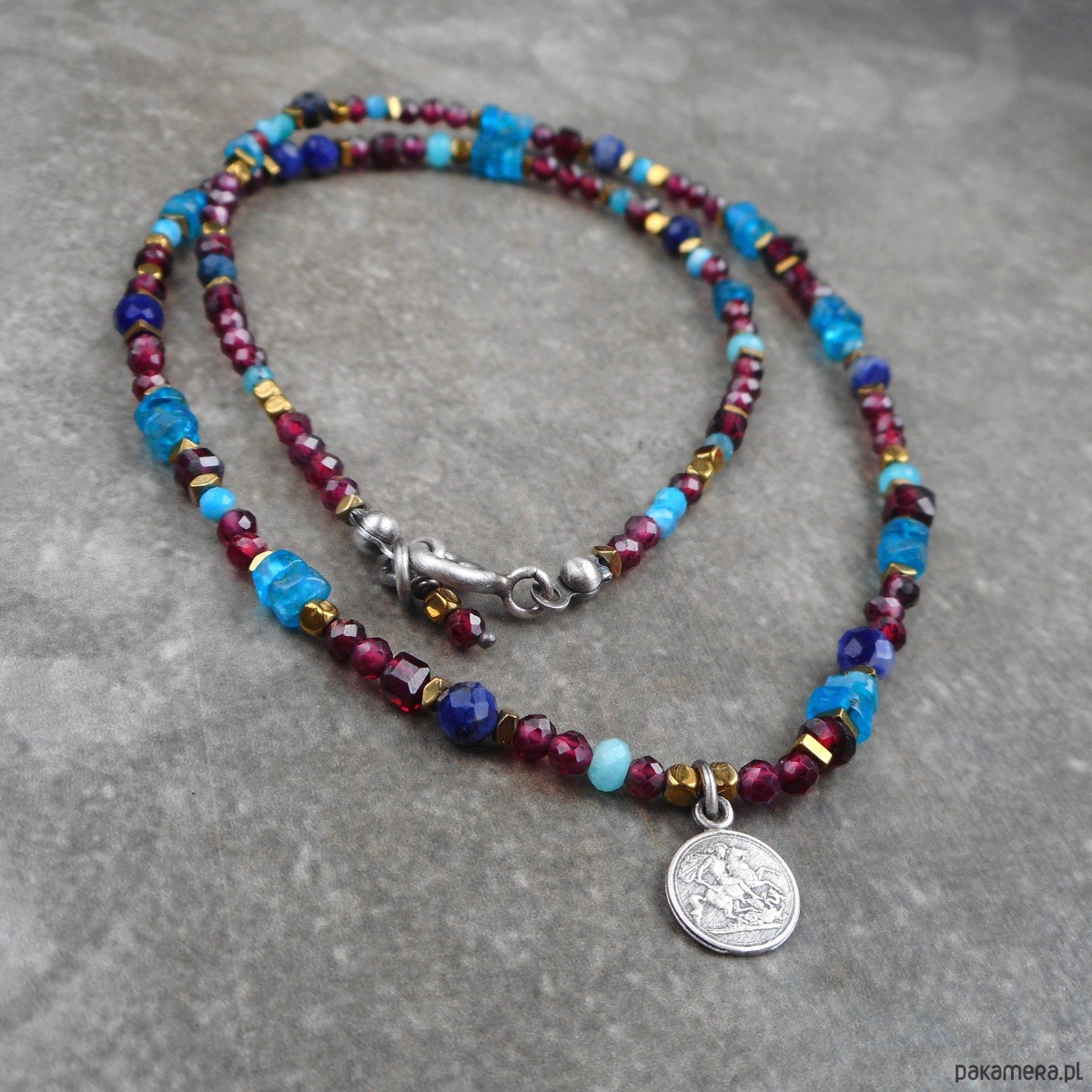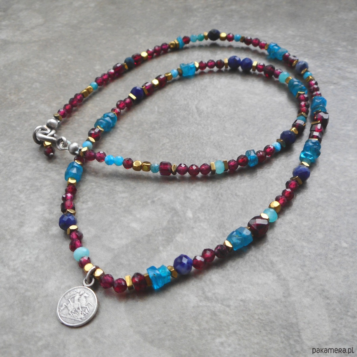 Piękny, krótki naszyjnik wykonany ze szlachetnego srebra i kamieni naturalnych; elegancki, lśniący, z połyskującymi granatami i apatytem, z małą zawieszką w formie monety.