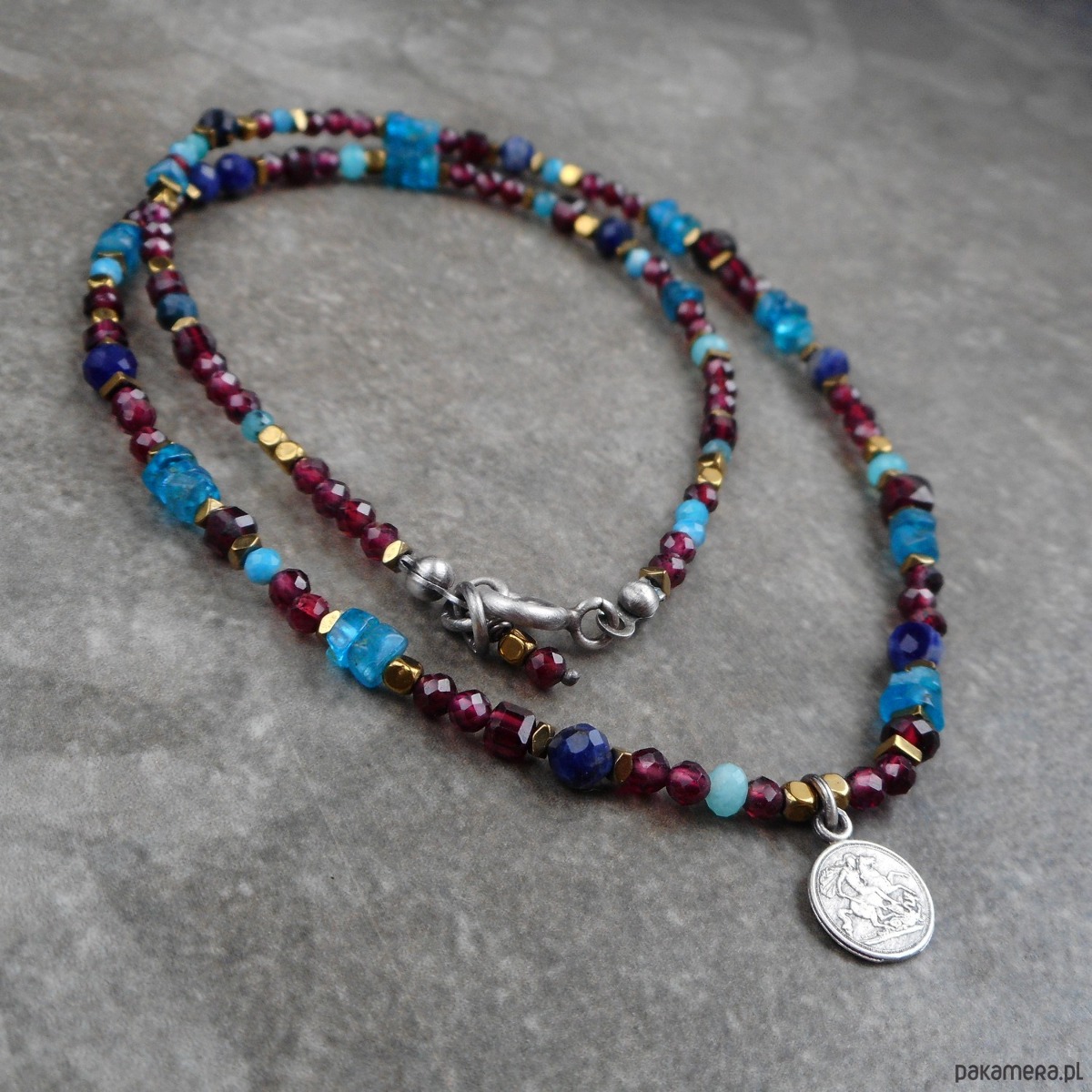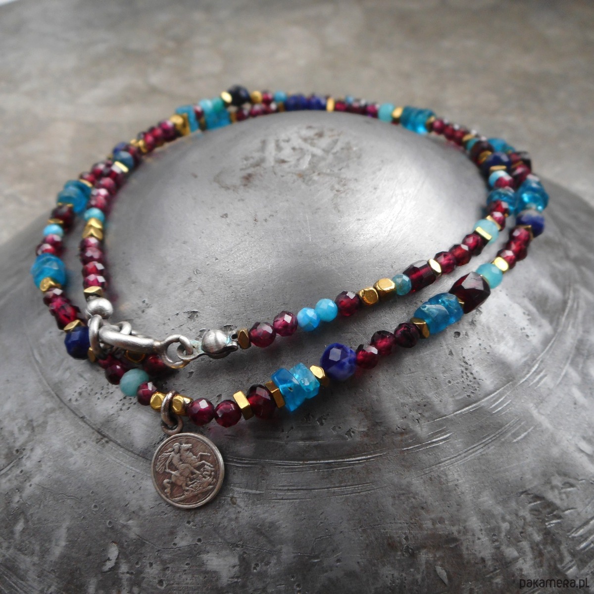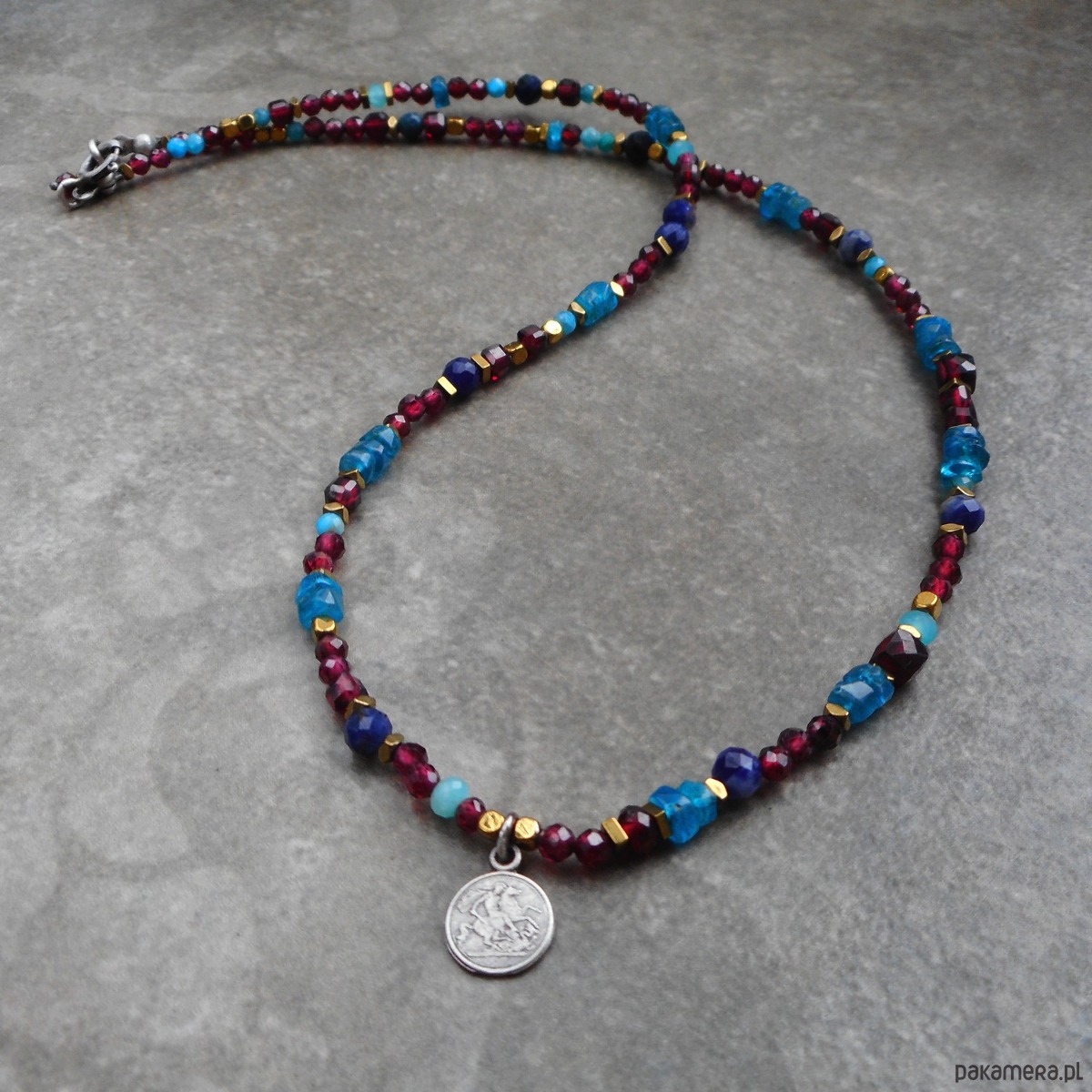 Piękny, krótki naszyjnik wykonany ze szlachetnego srebra i kamieni naturalnych; elegancki, lśniący, z połyskującymi granatami i apatytem, z małą zawieszką w formie monety.