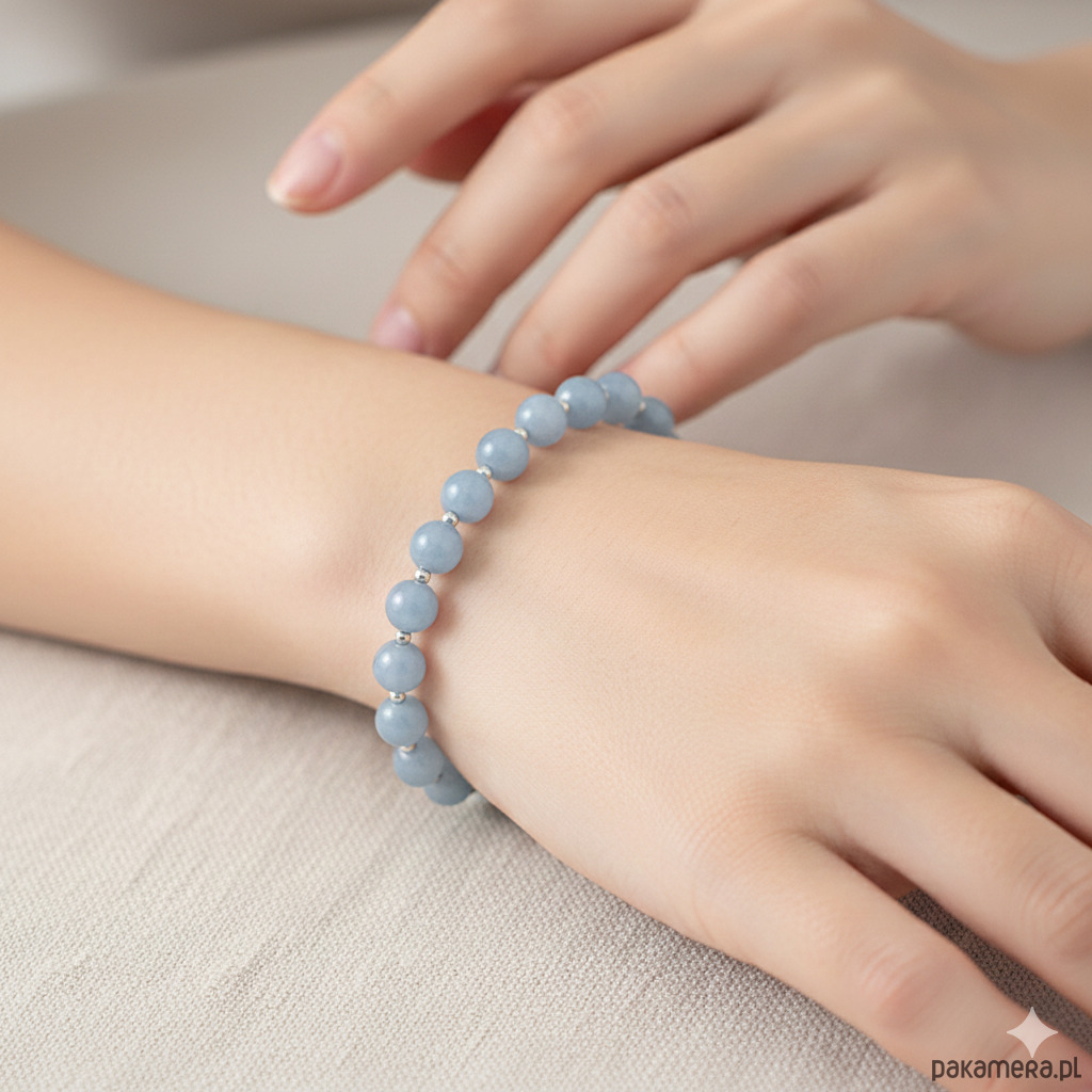 Śliczna bransoletka ze srebra z błękitnym angelitem (8mm).