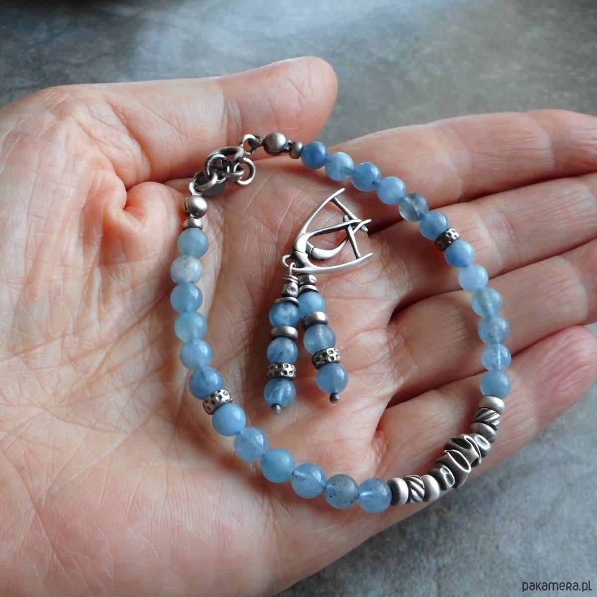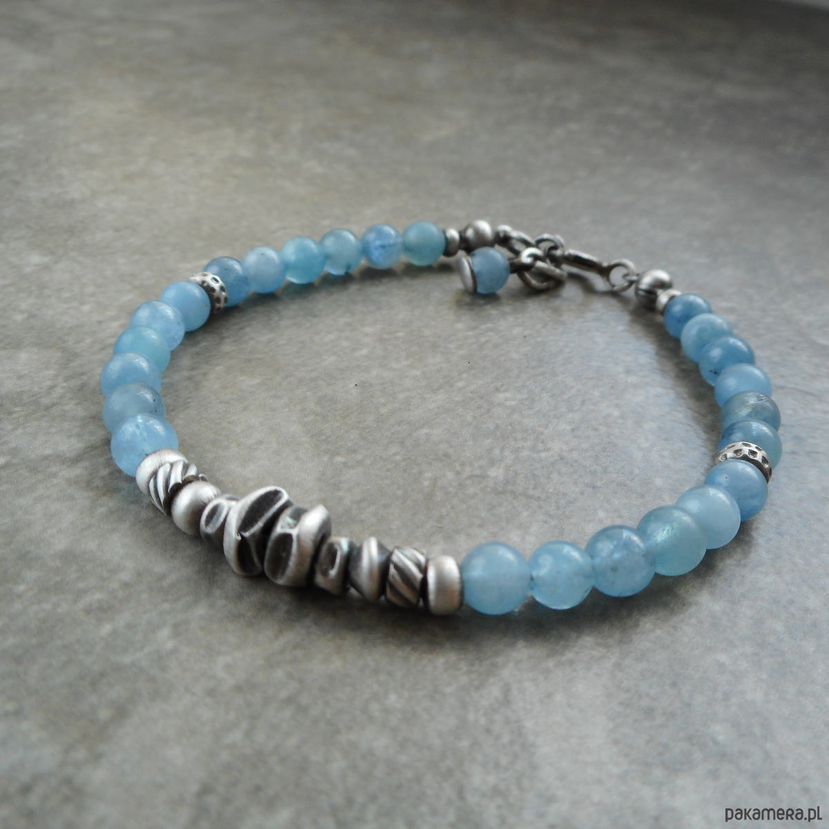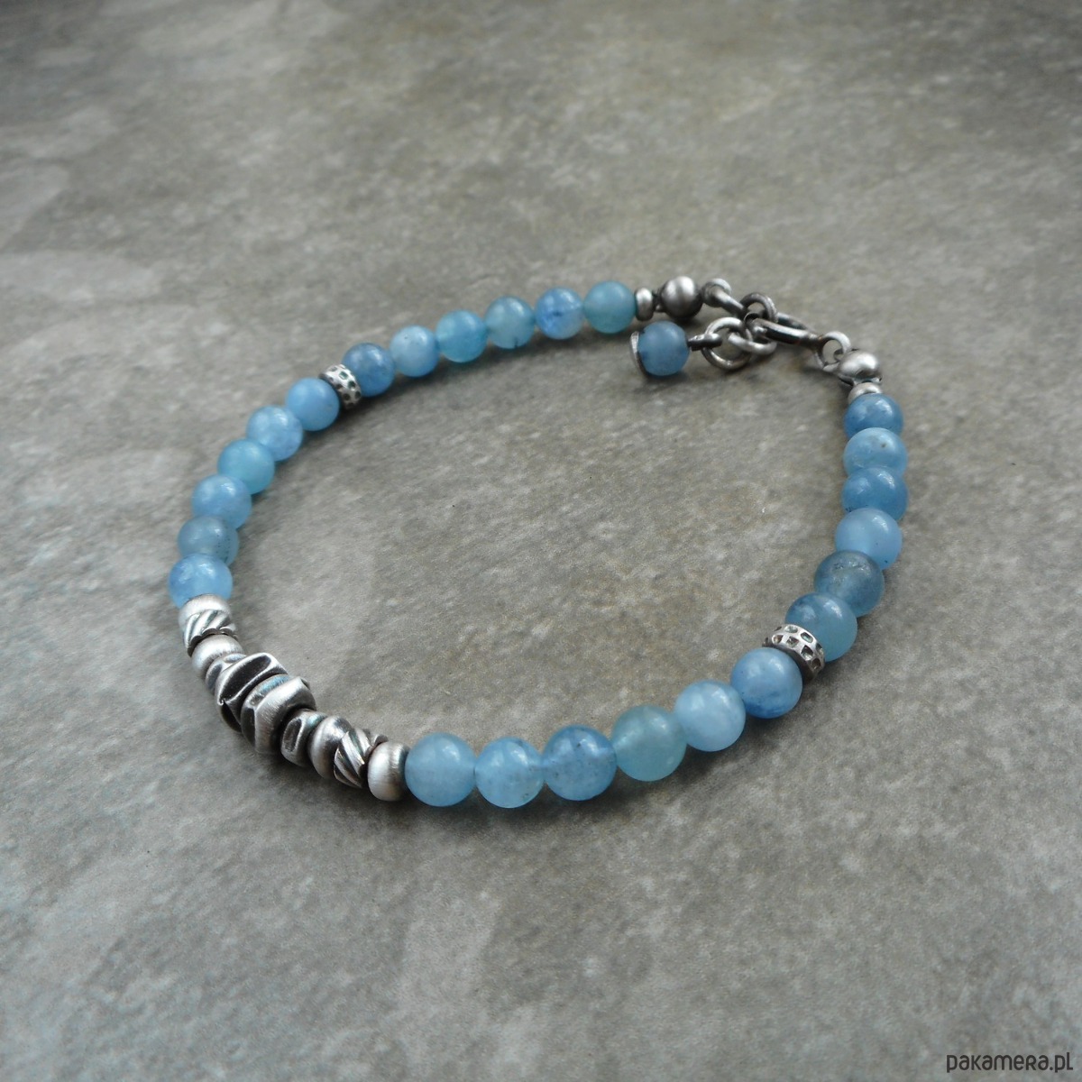 Piękna bransoletka z kamieni naturalnych i szlachetnego srebra; klasyczna i elegancka, błękitnymi akwamarynami (wysoka jakość) przekładanymi srebrnymi gniecionymi przekładkami.