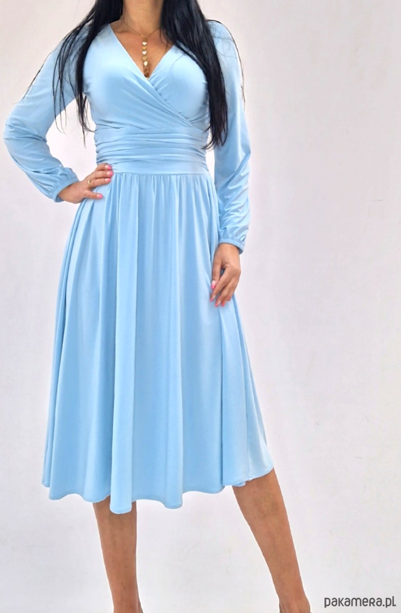 Błękitna wizytowa sukienka midi elegancka z długim rękawem – idealna na wesele, komunię, chrzciny i inne wyjątkowe okazje.