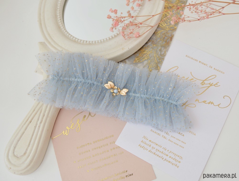 Tiulowa podwiązka uszyta z dwóch warstw tiulu w kolorze błękitnym (odcień gołębi) ze złotymi drobinkami. Pośrodku znajdują się złote listki oraz kwiatek z perłą Swarovskiego w kolorze niebieskim. Szerokość podwiązki 5 cm. Podwiązka bardzo wygodna, miękka i elastyczna. Podwiązki szyjemy w naszym atelier z najwyższej jakości materiałów.