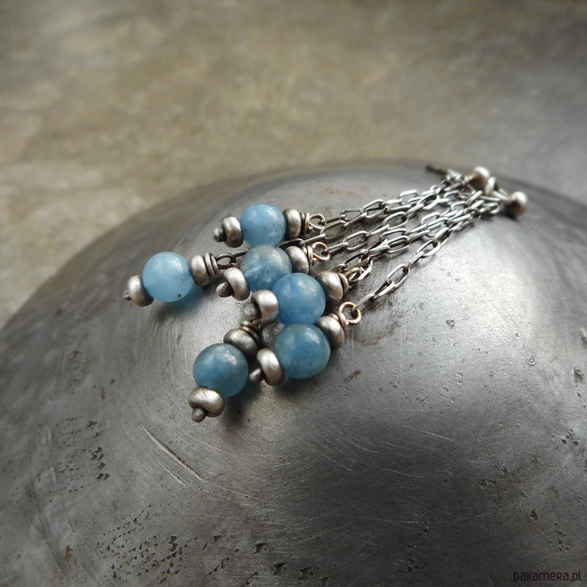 Kobiece, proste w formie kolczyki z kamieni naturalnych i szlachetnego srebra;  nie obciążające ucha, zwiewne, ich ozdobą są  akwamaryny w  pięknym czystym odcieniu błękitu.