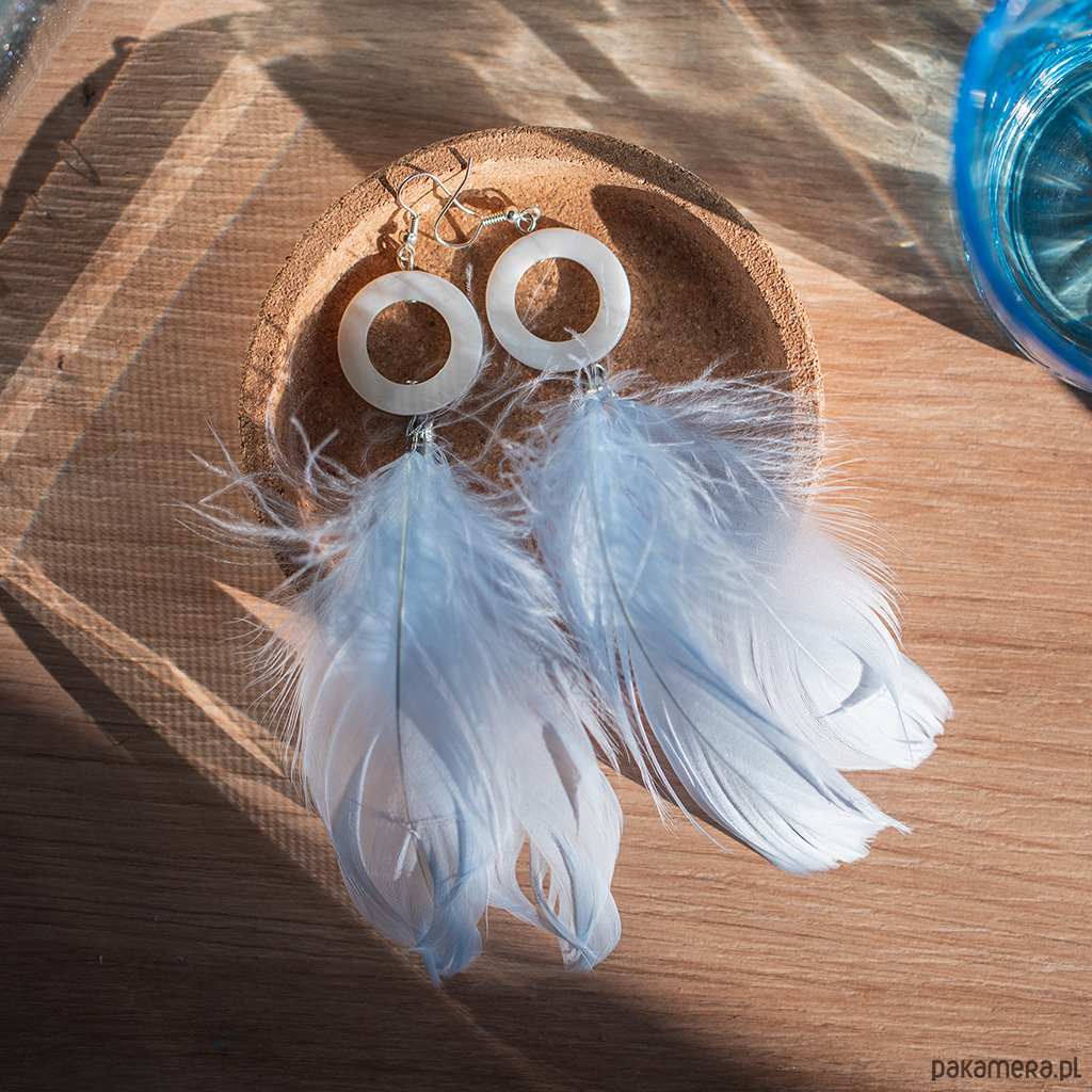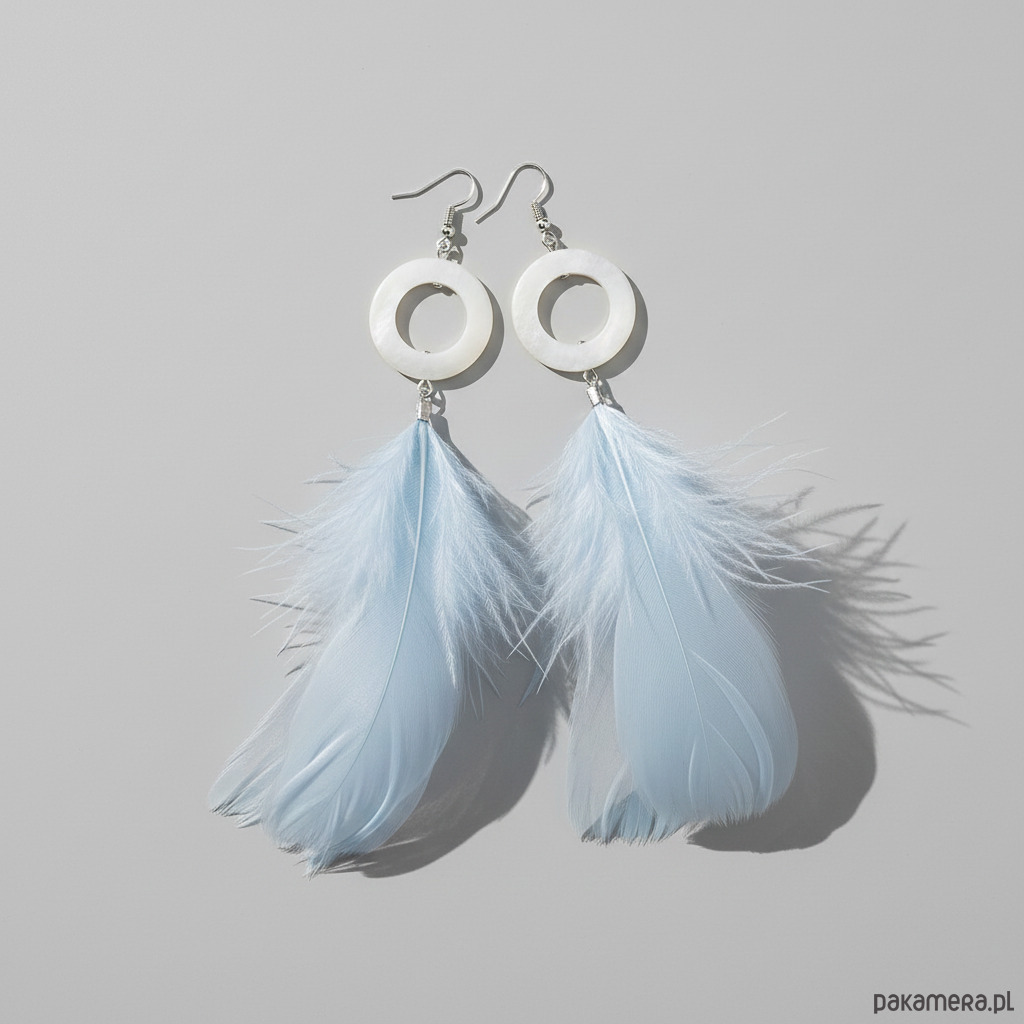Długie kolczyki w kolorze białym z masy perłowej i błękitnych, barwionych piór kaczych. Lekkie i efektowne, przyciągają wzrok naturalnym ruchem i subtelnym połyskiem.
