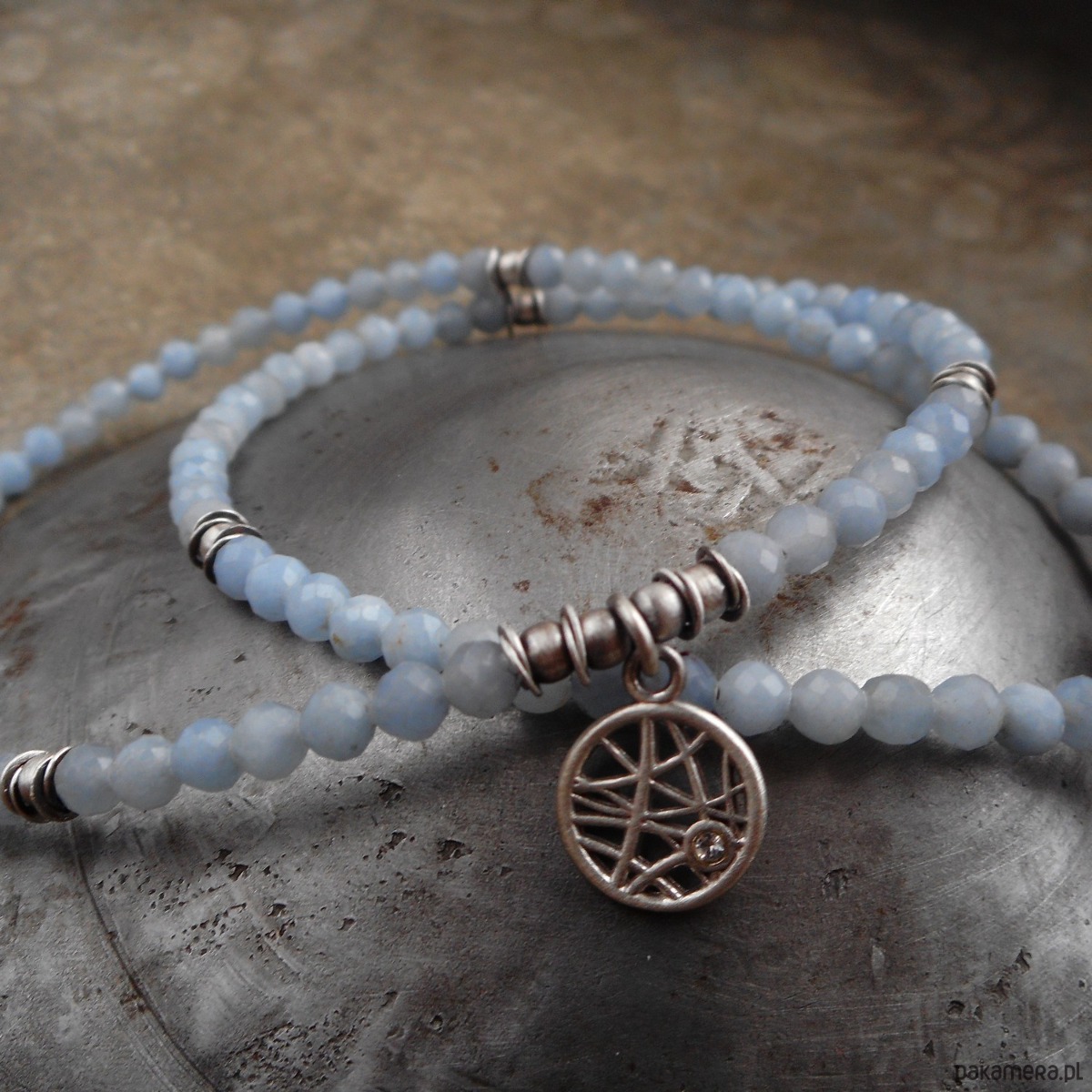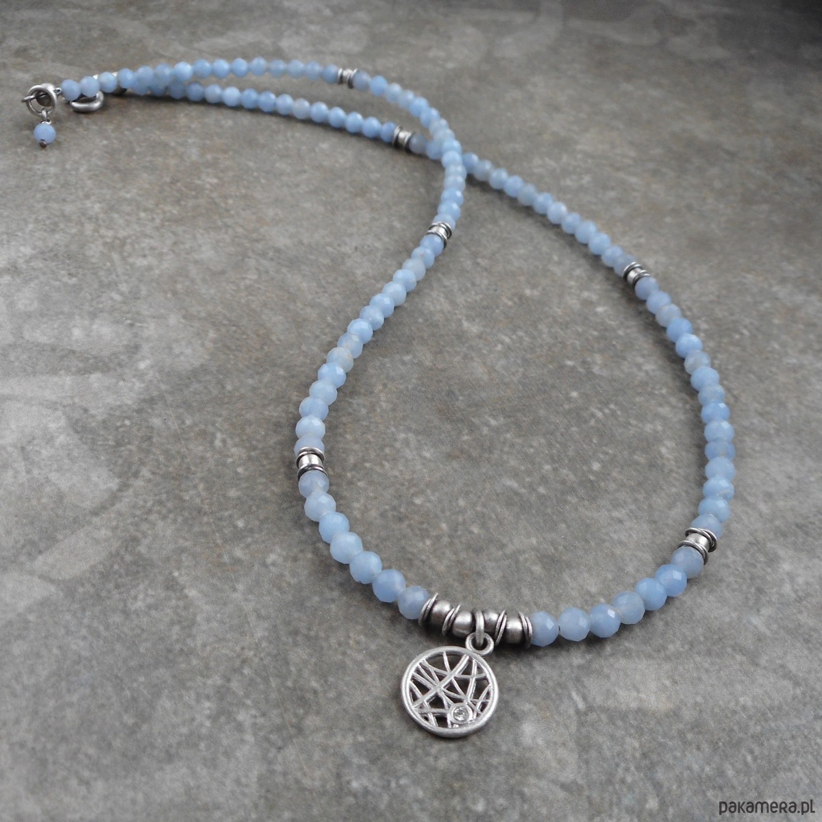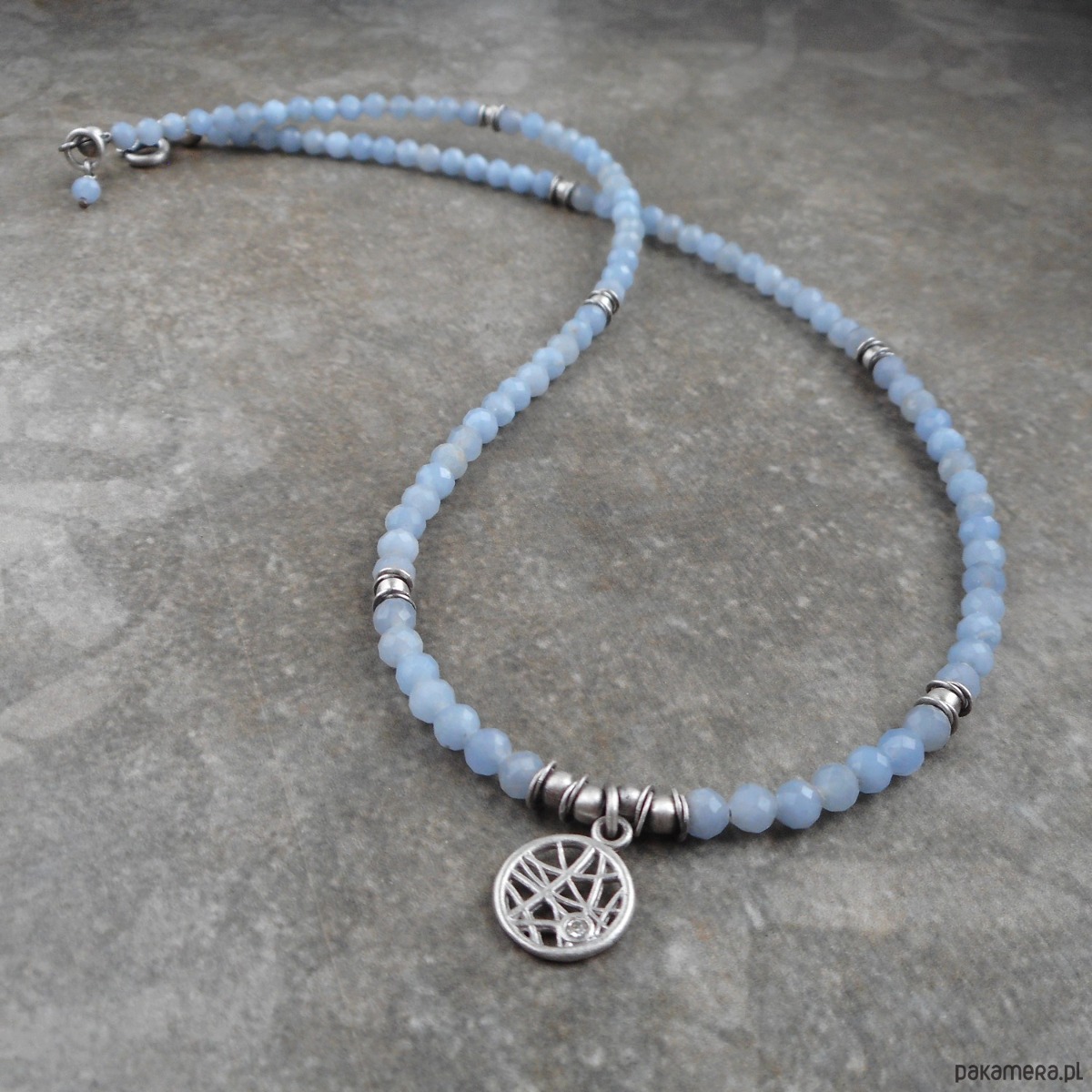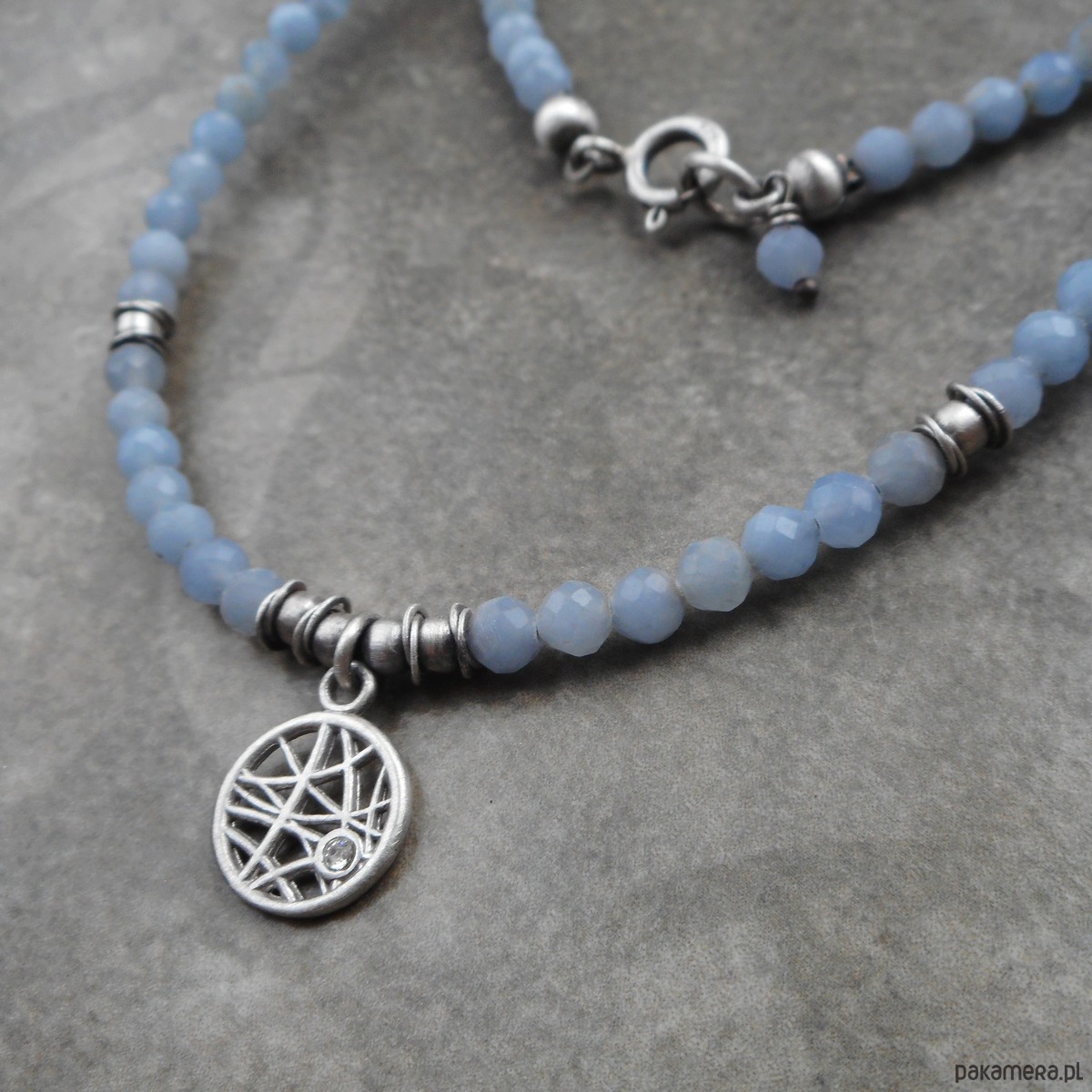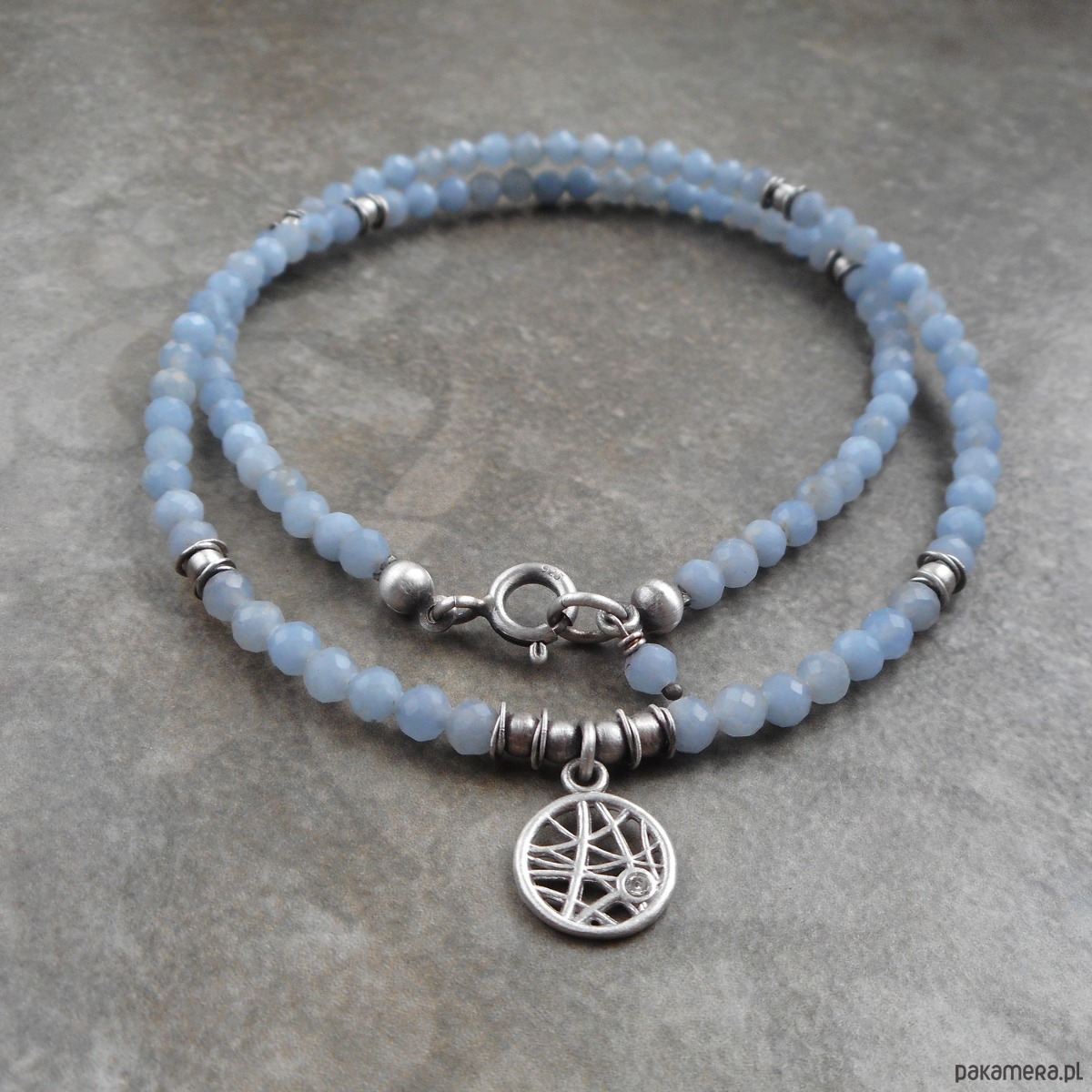 Bardzo kobiecy krótki naszyjnik wykonany ze szlachetnego srebra i kamieni naturalnych; elegancki, lśniący, w pięknym odcieniu złamanego błękitu.