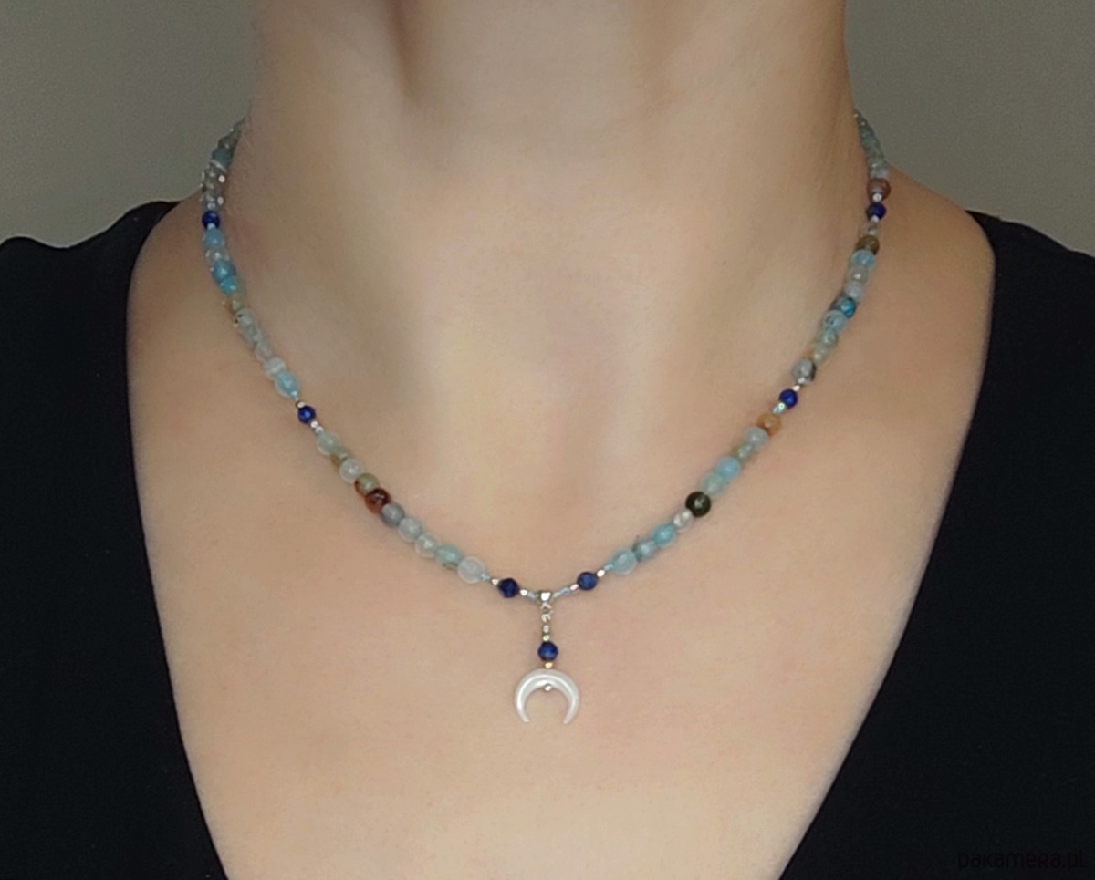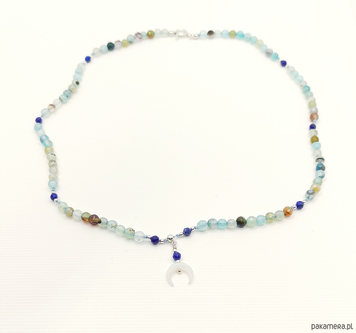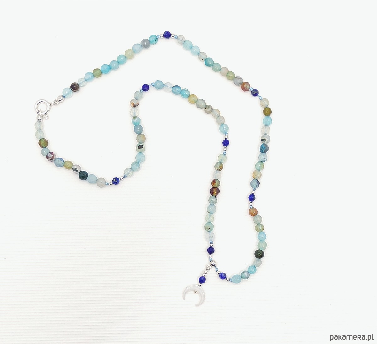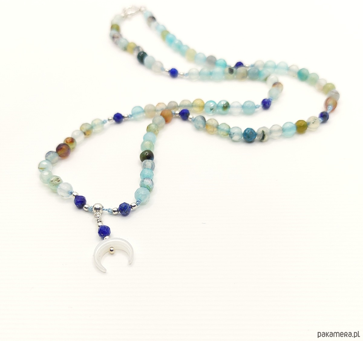 Sznur agatów w jasnym błękicie nanizanych na jedwabną nić. Dla podkreślenia nuty granatu dodane zostały drobne fasetowane kuleczki lapis lazuli. Całość w otoczeniu srebrnych dodatków z wyeksponowaną zawieszką księżycem. Została ona wykonana z pięknej muszli, gładko wyszlifowanej. Delikatnie mieni się, jest zwieńczeniem tego uroczego sznura.