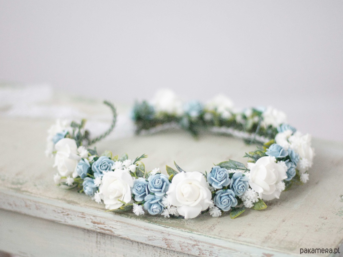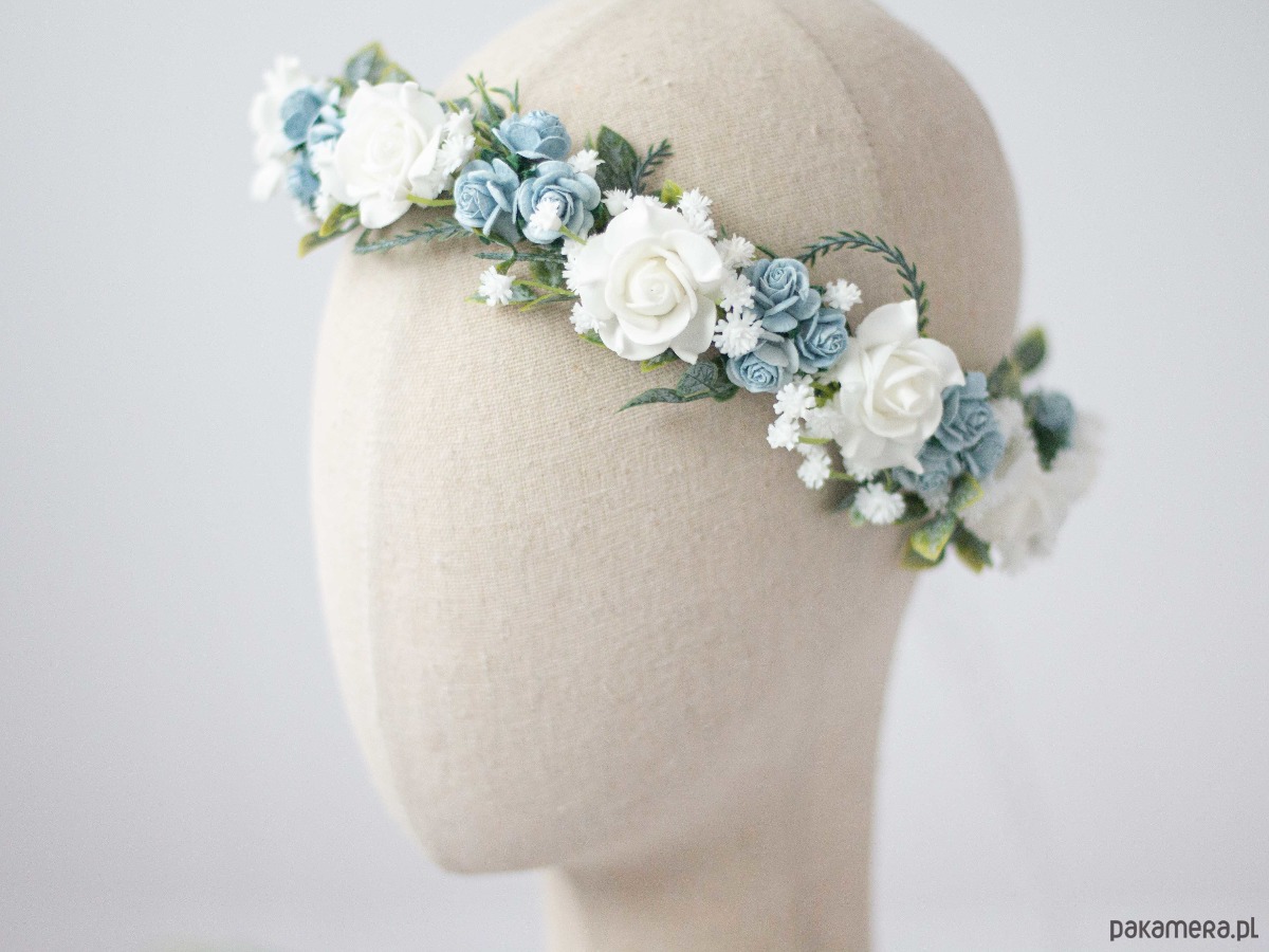 Romantyczny wianek na głowę wykonany z pastelowych różyczek z panki i papieru, zielonych, syntetycznych listków i gipsówki. Możliwość regulacji wielkości obwodu, dzięki koronkowej tasiemce z tyłu. Będzie pasował zarówno na głowę dziecka, jak i osoby dorosłej.