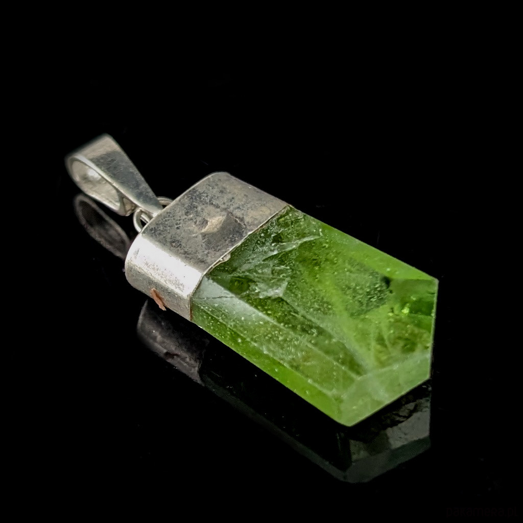 Wisiorek ze srebra próby 925 z oprawionym pięknym oliwinem z gładko oszlifowaną taflą w formie kryształowej bryły. Wymiary oprawy 23 x 13 mm. Długość max 24 mm. Waga 4 g.