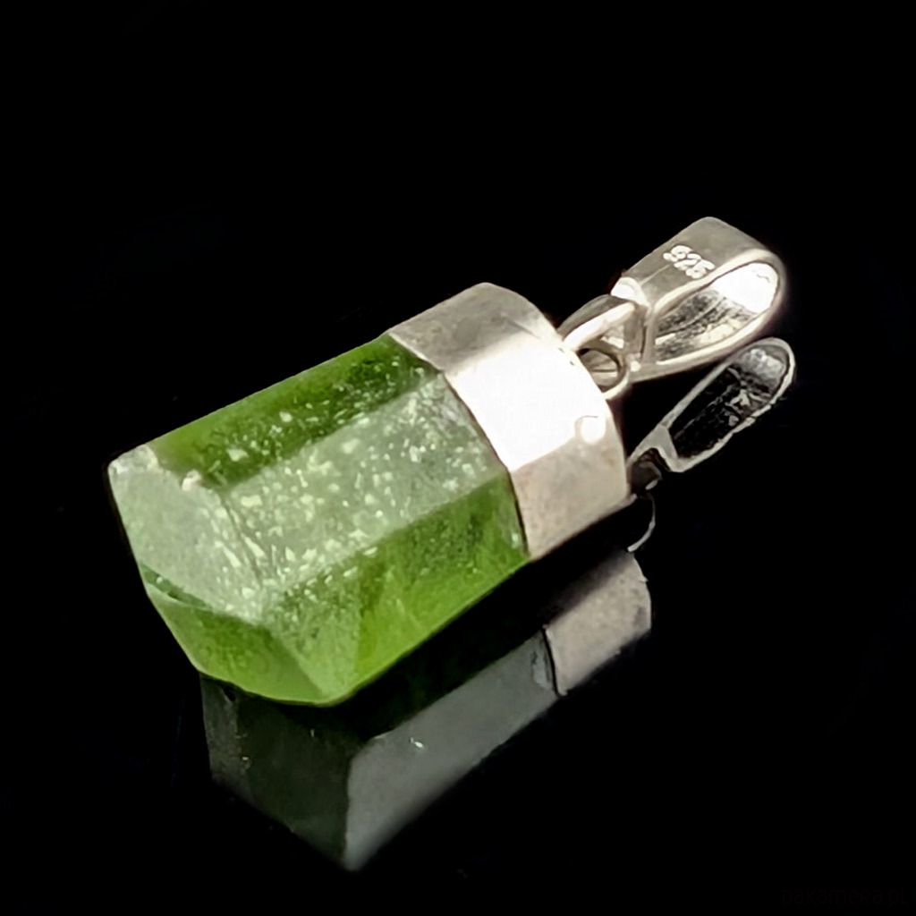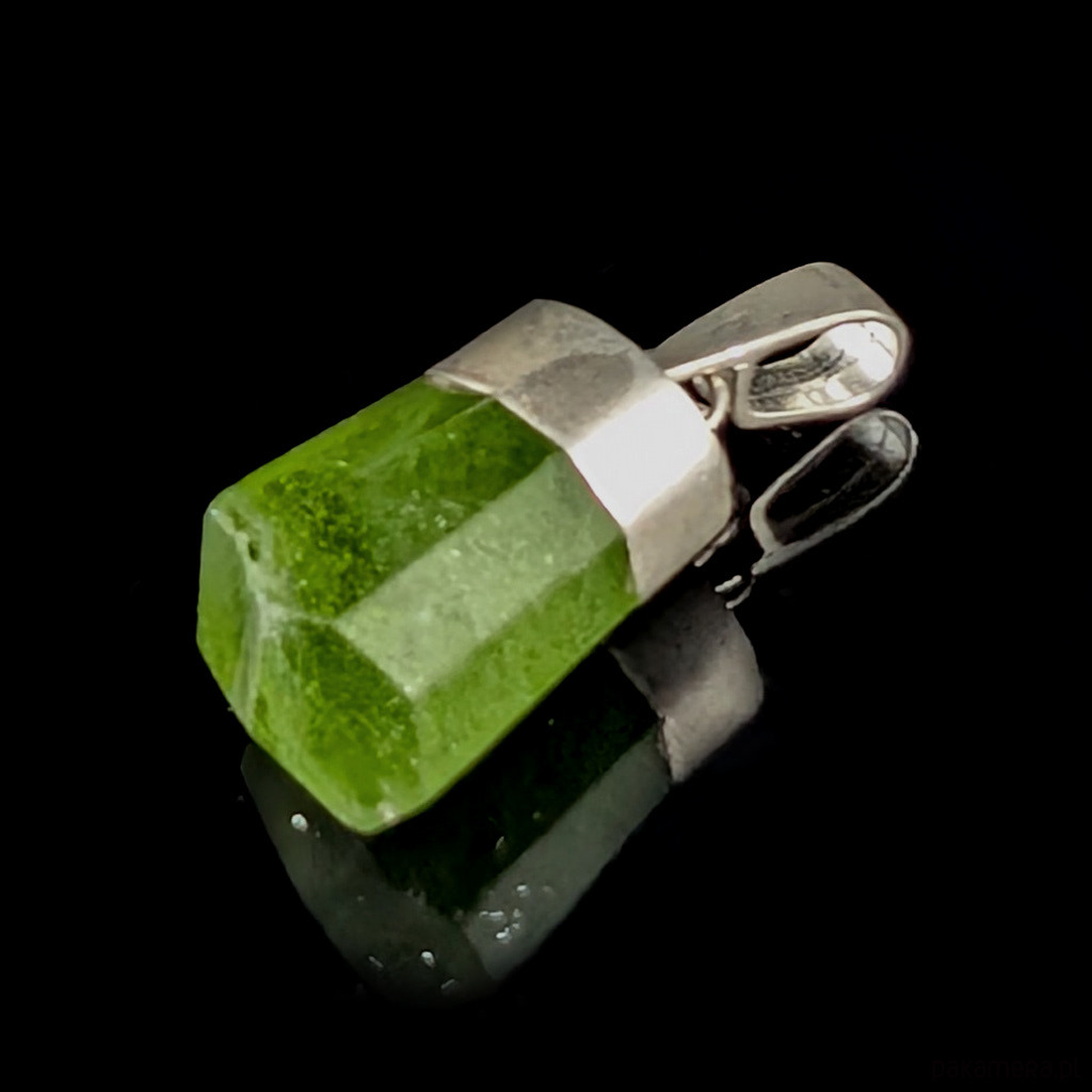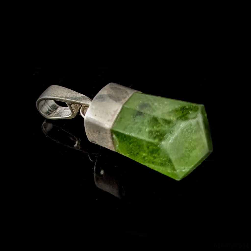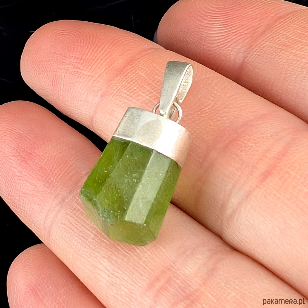 Wisiorek ze srebra próby 925 z oprawionym pięknym oliwinem z gładko oszlifowaną taflą w formie kryształowej bryły. Przepiękny okaz. Wymiary oprawy 17 x10 mm. Długość max 27 mm. Waga 3,46 g.