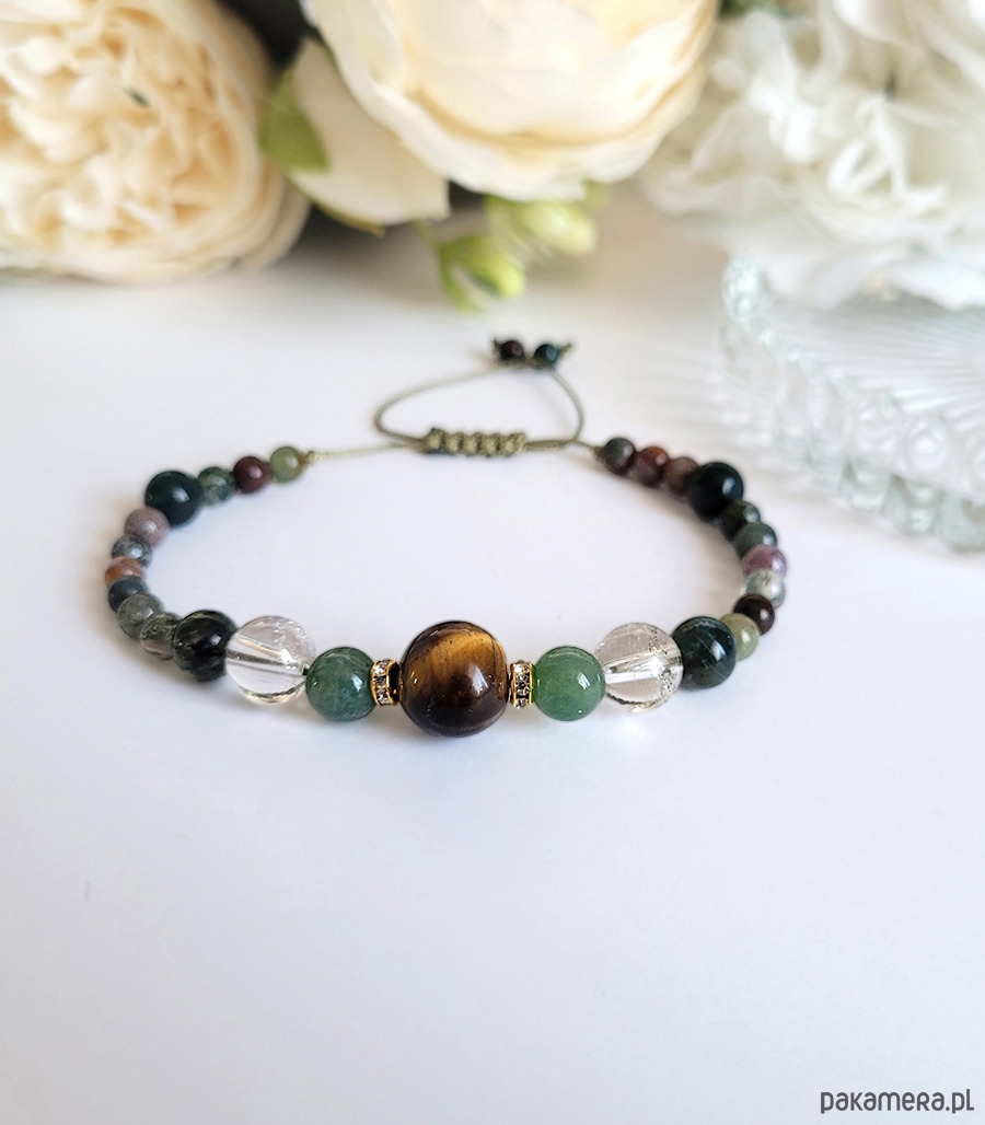 Damska bransoletka z kamieni naturalnych: Agatu mszystego, Tygrysiego oka, Agatu indyjskiego oraz Kryształu górskiego głównie przeznaczona dla zodiakalnych Bliźniaków.