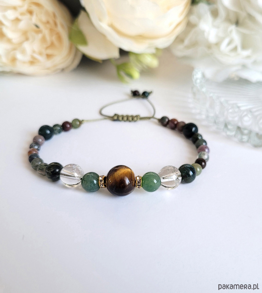 Damska bransoletka z kamieni naturalnych: Agatu mszystego, Tygrysiego oka, Agatu indyjskiego oraz Kryształu górskiego głównie przeznaczona dla zodiakalnych Bliźniaków.