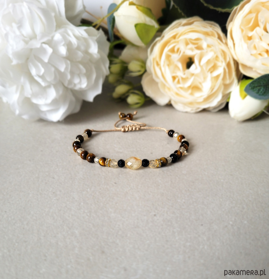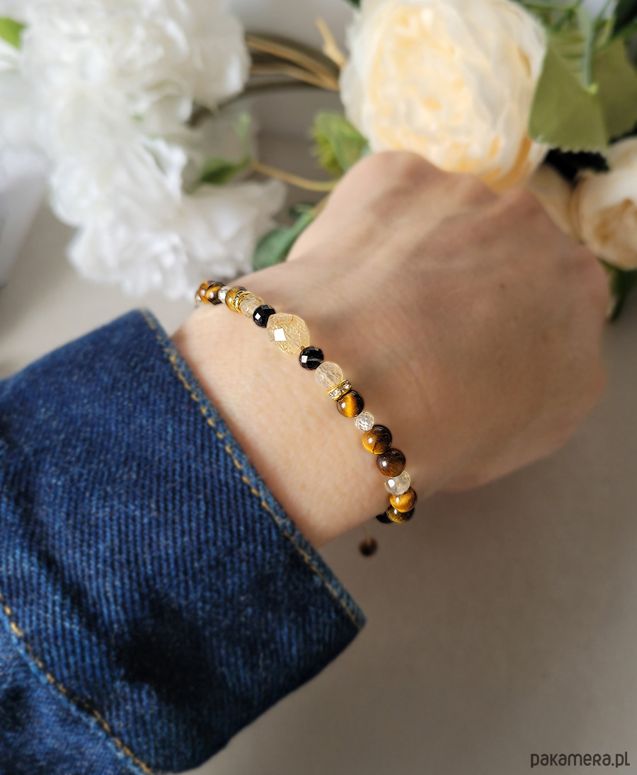 Bransoletka zrobiona z kamieni naturalnych: Turmalinu, Cytrynu, Tygrysiego oka, Hematytu i Cyrkonii głównie przeznaczona dla zodiakalnego Wodnika.
