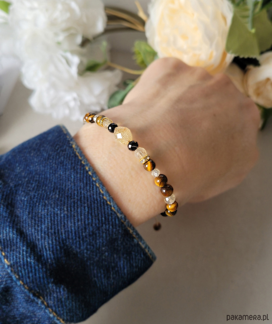 Bransoletka zrobiona z kamieni naturalnych: Turmalinu, Cytrynu, Tygrysiego oka, Hematytu i Cyrkonii głównie przeznaczona dla zodiakalnego Wodnika.