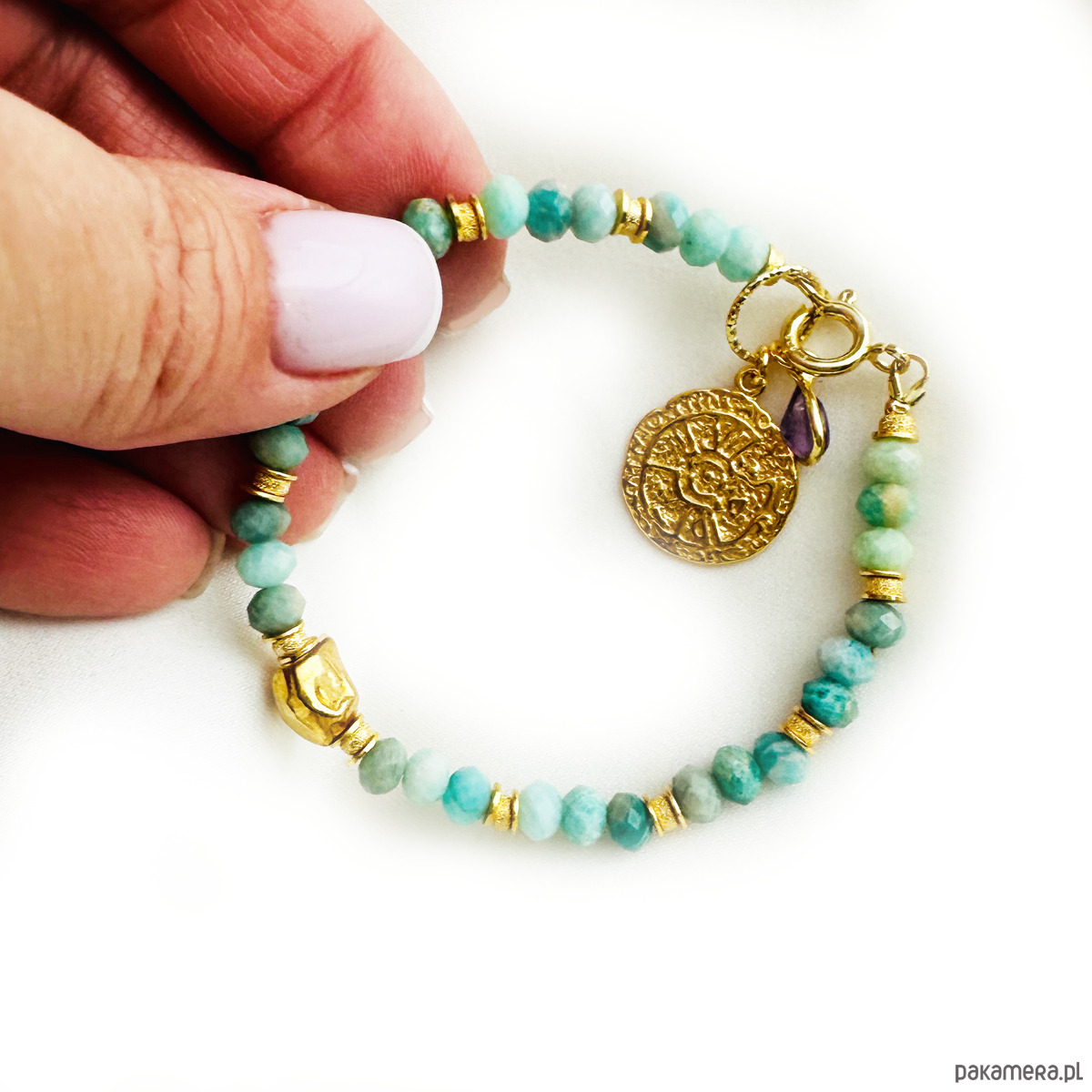 Bransoletka wykonana jest ręcznie z naturalnych amazonitów w kształcie oponki, z efektownymi zawieszkami z pozłacanego srebra- monetką oraz ametystem w oprawie . srebrnych złoconych 24 k złotem koralików i elementów.