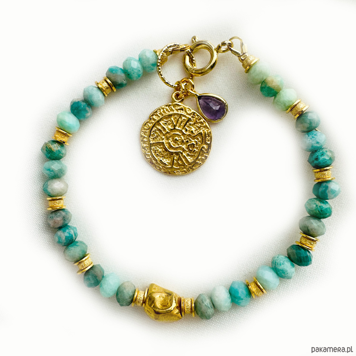 Bransoletka wykonana jest ręcznie z naturalnych amazonitów w kształcie oponki, z efektownymi zawieszkami z pozłacanego srebra- monetką oraz ametystem w oprawie . srebrnych złoconych 24 k złotem koralików i elementów.