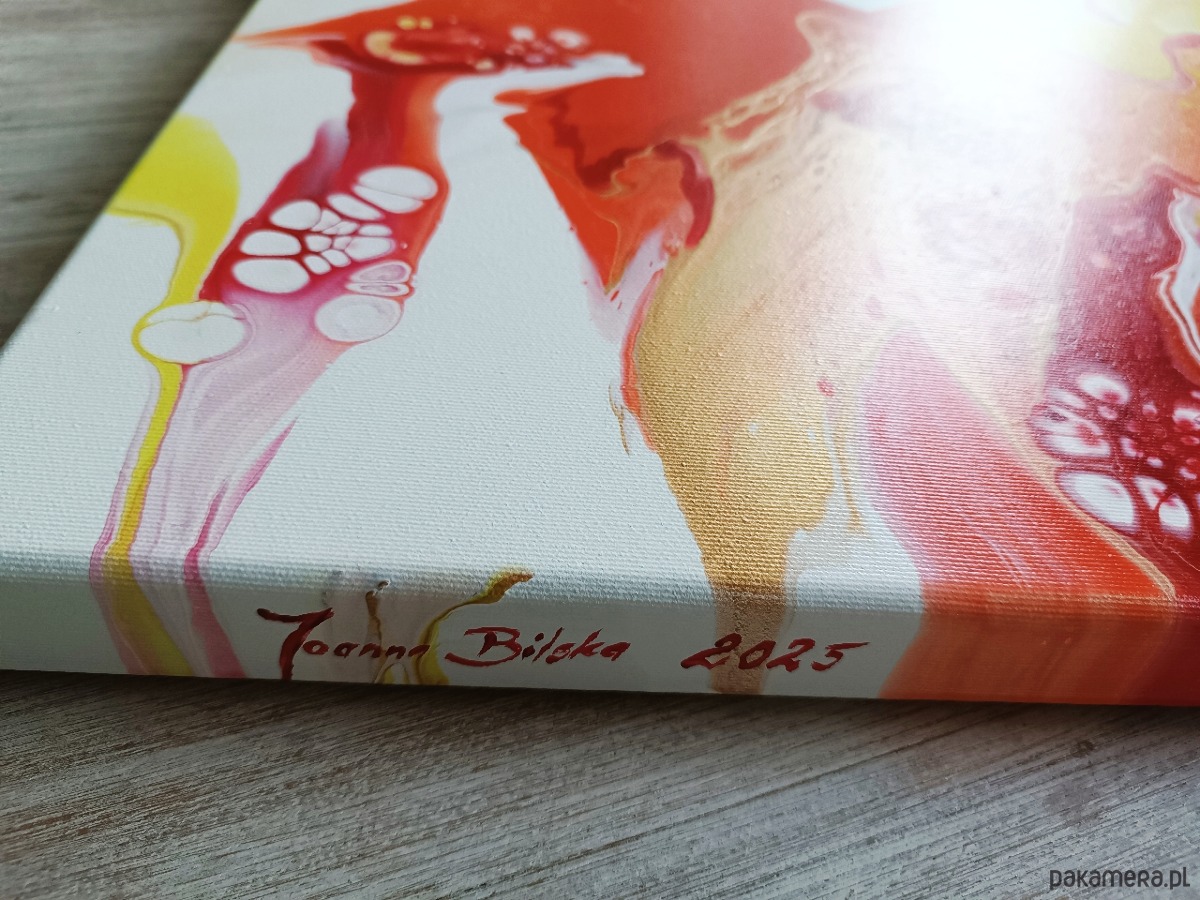 Obraz abstrakcyjny malowany farbami i tuszem akrylowym na podobraziu bawełnianym polskiej produkcji. Solidne, cięższe podobrazie typu 3D, czyli z grubszym bokiem 3,5 cm, który jest przedłużeniem obrazu. Zabezpieczony werniksem, gotowy do powieszenia (na ostatnim zdjęciu widac tył obrazu).