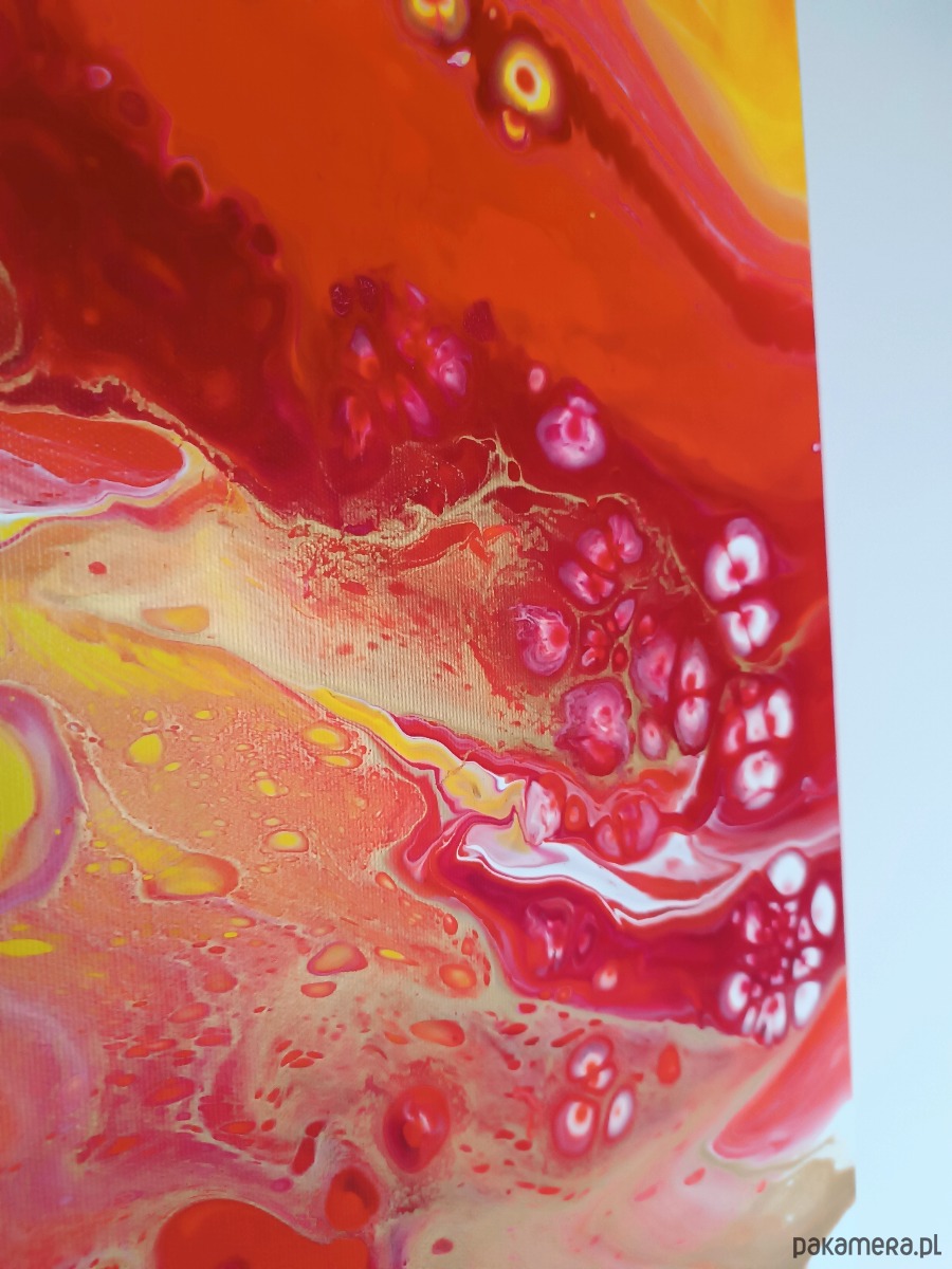 Zastosowałam technikę pouringu, czyli operowania farbami w stanie ciekłym, dodatkowo dodając pięknie napigmentowanych tuszy akrylowych.