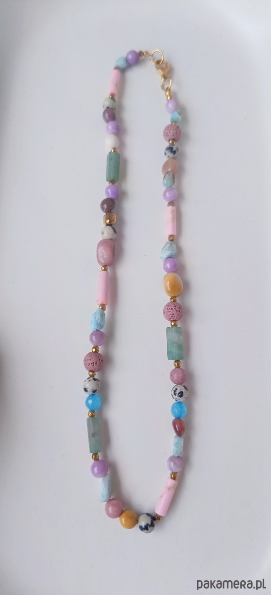 Naszyjnik z naturalnych kamieni : mokaitu,jaspisu dalmatyńskiego,larimaru,agatów ,złotych hematytów i agatów i awenturynu.