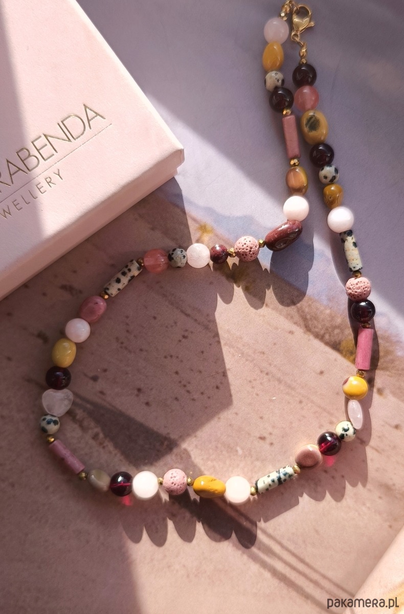 Naszyjnik z naturalnych kamieni : mokaitu,jaspisu dalmatyńskiego,agatów ,złotych hematytów ,rodonitu granatów na nici jedwabnej i z wykończeniami ze stali chirurgicznej.Dlugość na życzenie.