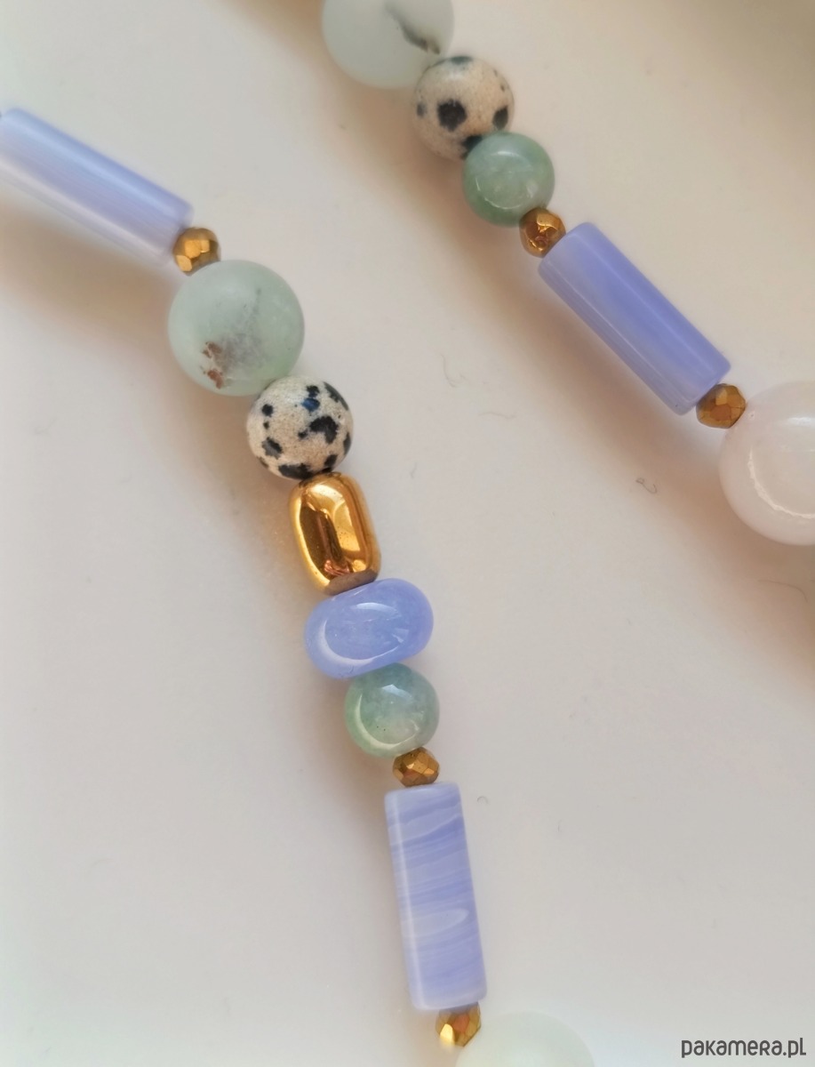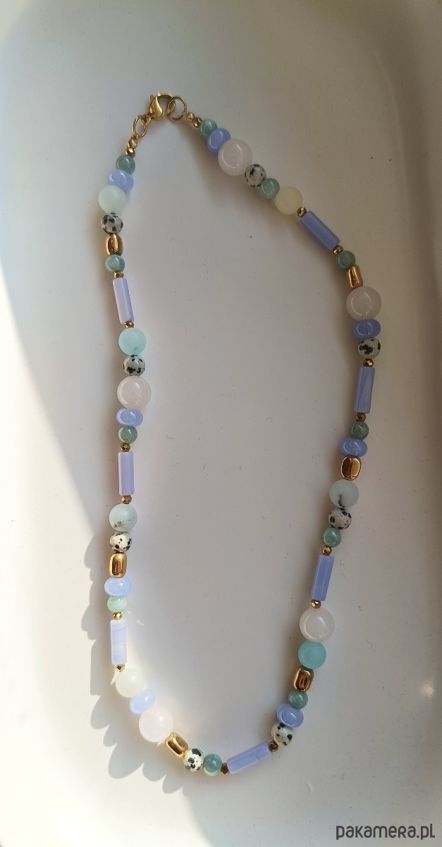 Naszyjnik z naturalnych kamieni,amazonitu,jaspisu dalmatyńskiego,agatów i złotych hematytów na nici jedwabnej i wykończeniami ze stali chirurgicznej.Dlugość 47cm.