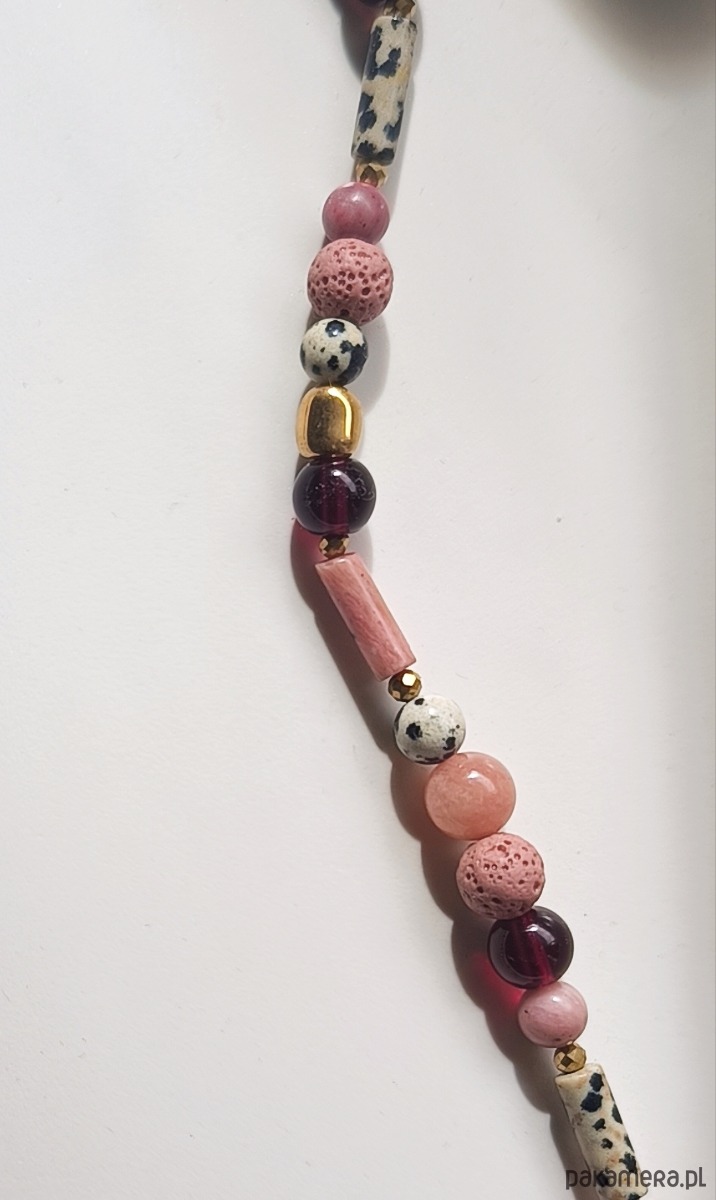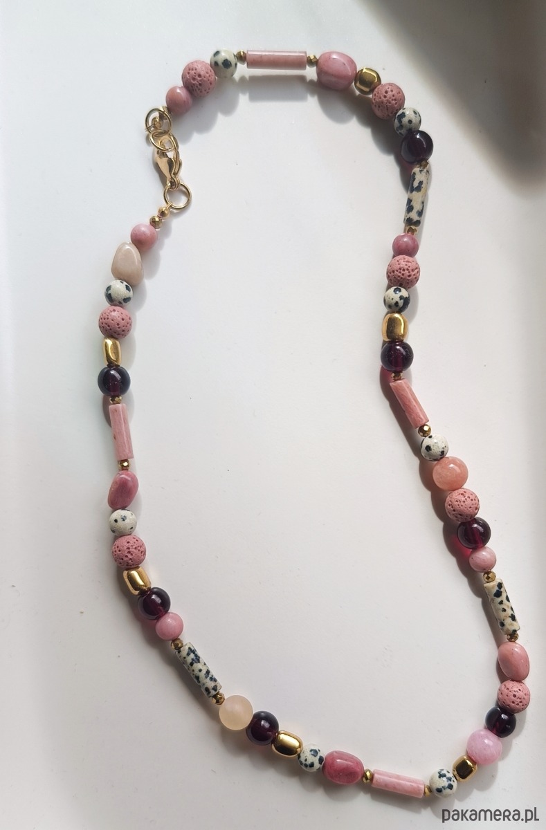 Naszyjnik z naturalnych kamieni :jaspisu dalmatyńskiego,agatów ,złotych hematytów,różowej lawy wulkanicznej ,rodonitu granatów i kwarców różowych na nici jedwabnej i z wykończeniami ze stali chirurgicznej.Dlugość 47cm.