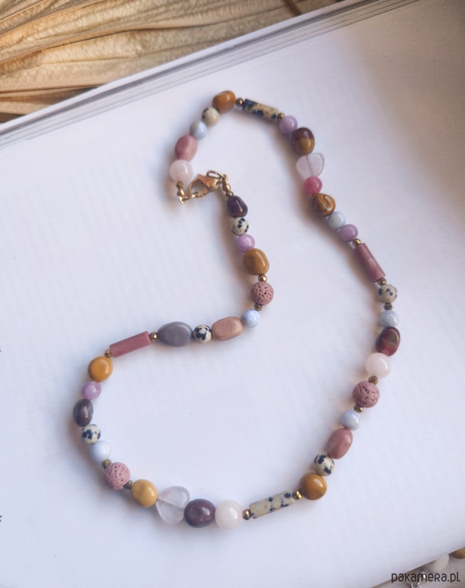 Naszyjnik z naturalnych kamieni : mokaitu,jaspisu dalmatyńskiego,agatów ,złotych hematytów ,rodonitu granatów i kwarców różowych na nici jedwabnej i z wykończeniami ze stali chirurgicznej.Dlugość 45.5cm.
