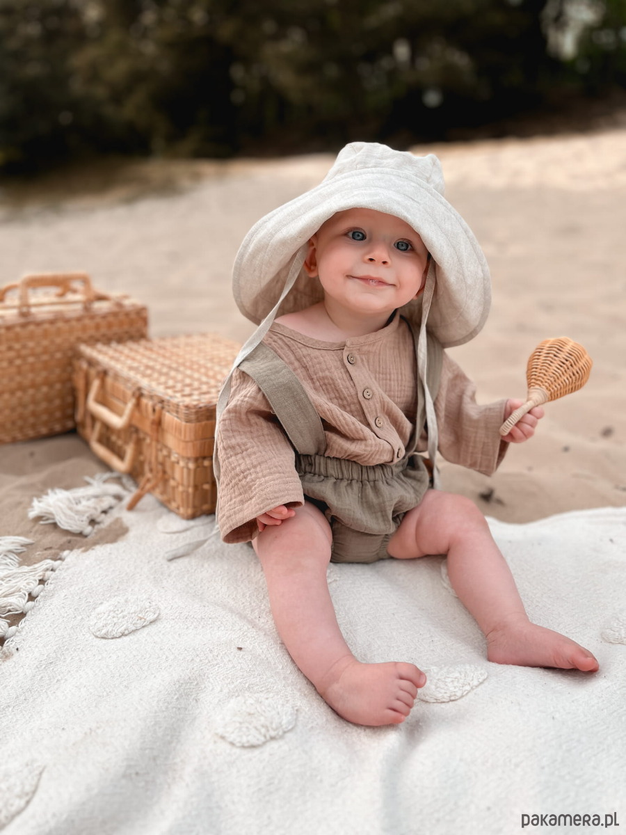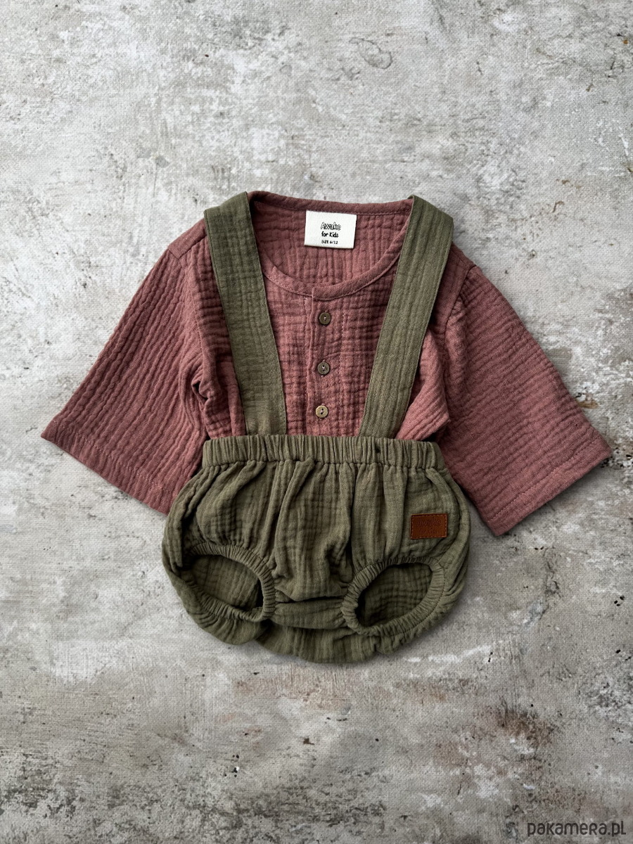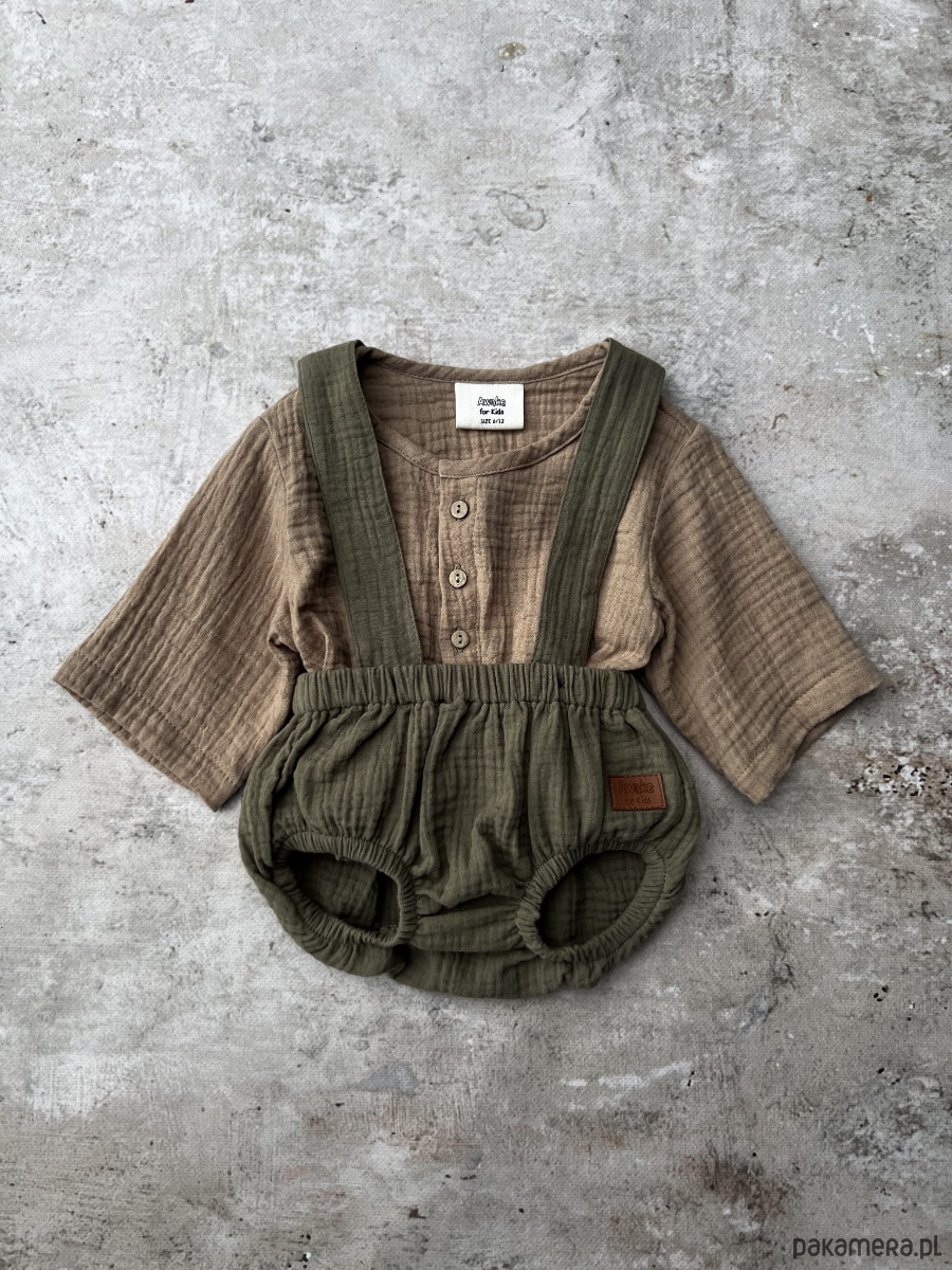 Bloomersy mają szelki zapinane na kokosowe guziczki, które można odpiąć. Są regulowane, dzięki czemu ubranko wystarcza na więcej niż jeden sezon. Świetnie pasują do zestawu z koszulą muślinową oversize. Uniwersalne, pasują na chłopców i dziewczynki.