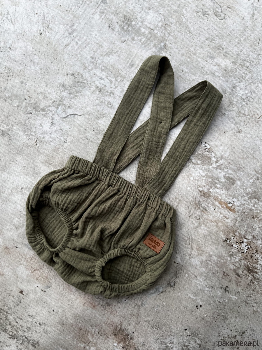 Bloomersy uszyte ze 100% bawełnianego muślinu w kolorze zgaszonej zieleni moss green.
